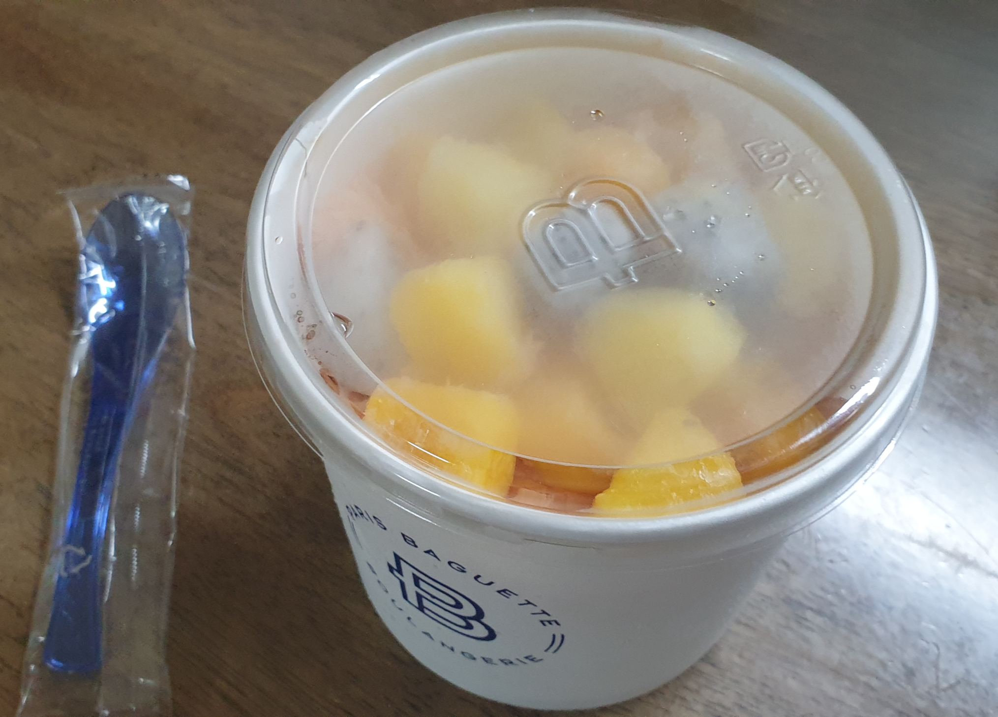 일단 크기에서는 실망이었네요. 작년이었나 먹었던 파리바게트 일반 팥빙수 컵보다 작은 컵이고 핸드폰보다 높이가 낮습니다. 숟가락은 이쁜 파란 숟가락이네요.
