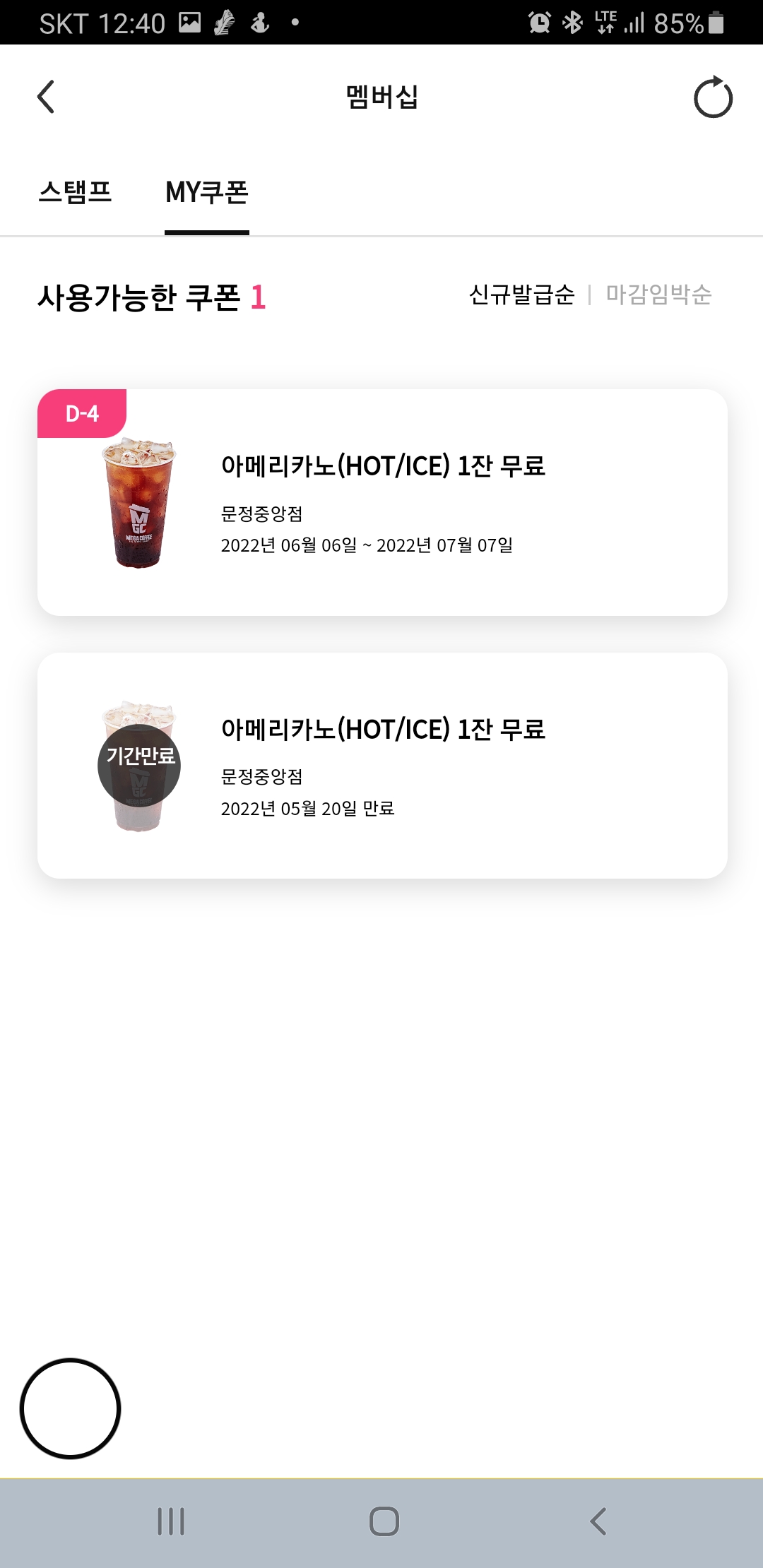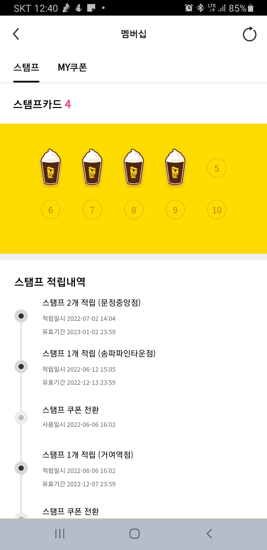 보니깐 스탬프 유효기간은 6개월이고 스탬프 10개 모아서 쿠폰으로 발급되면 쿠폰은 한 달간 사용 가능...