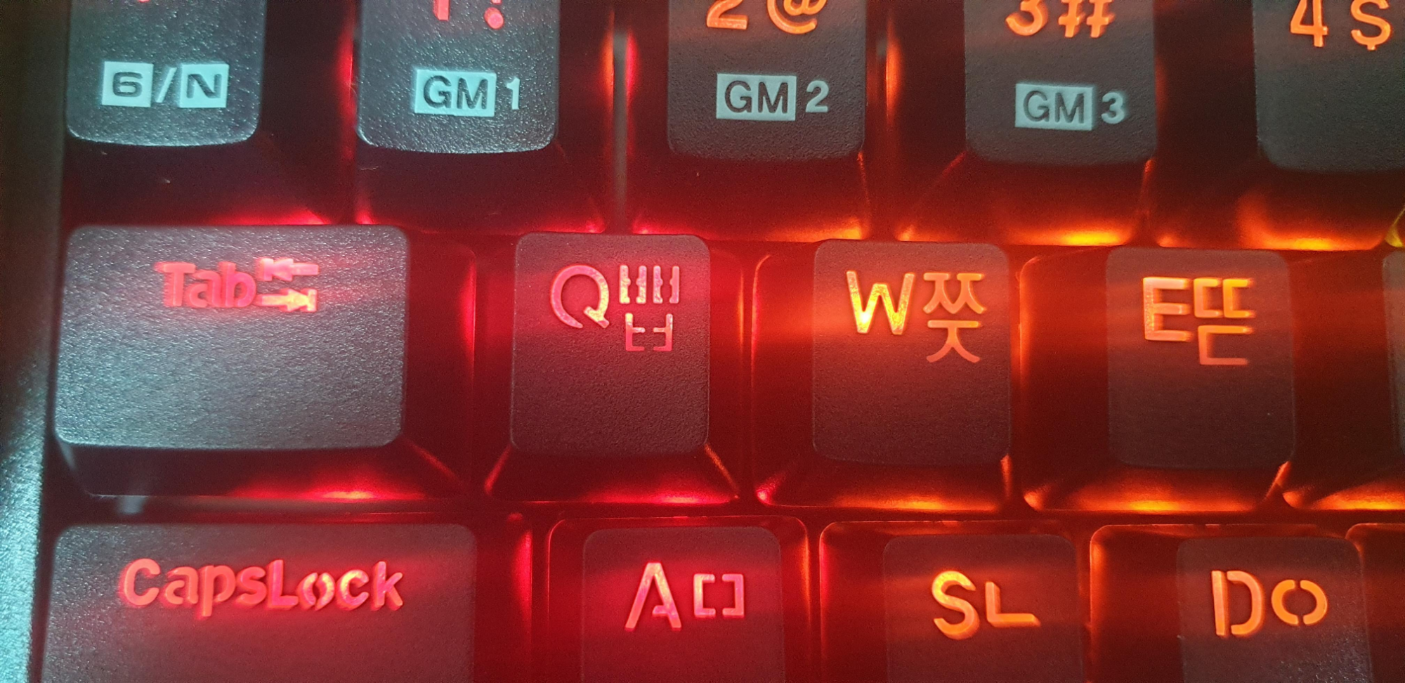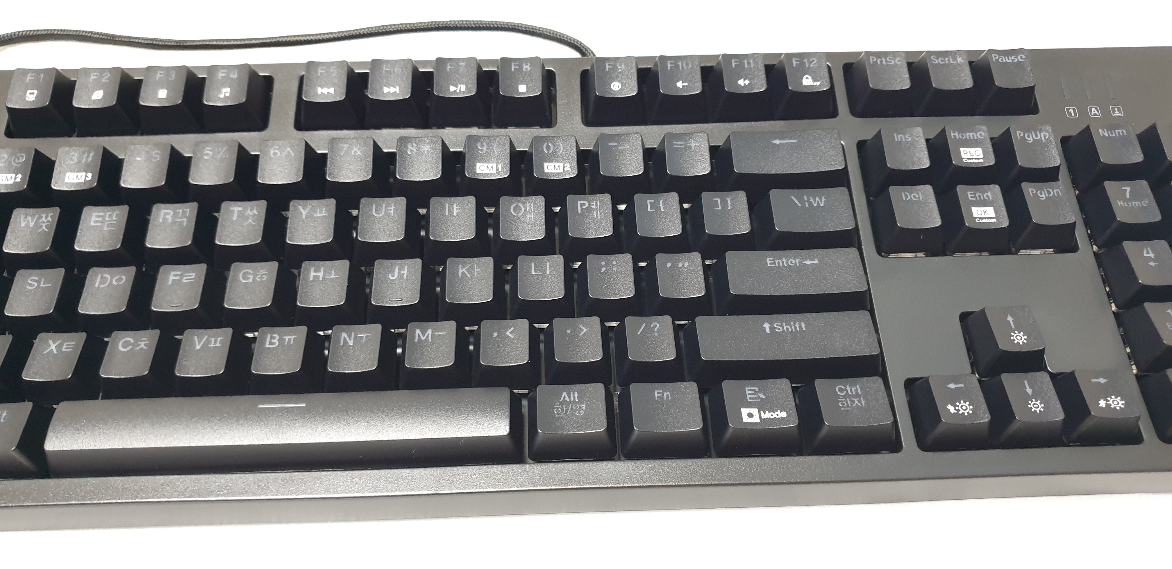 일단 첫 번째 멀리서 보면 모르지만 키캡의 led 부분의 문제 때문에 한글 키캡 하단까지 LED 빛이 고르게 보이지 않는 점