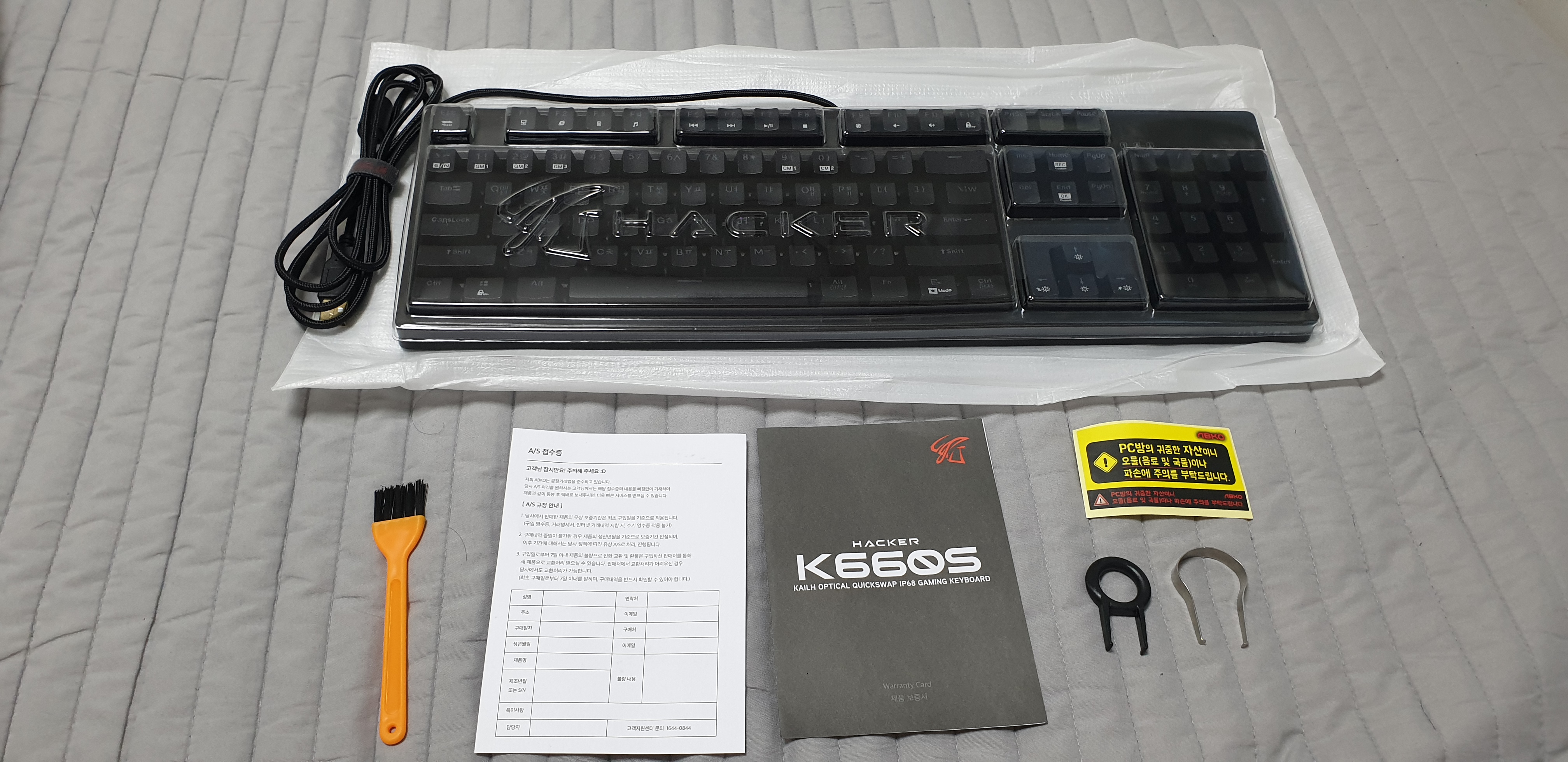 구성품은 역시나 pc방에 납품 많이 하는 해커 키보드답게 pc방 자산 스티커와 키캡 청소와 축 교환 용품 몇 개, 플라스틱 키보드 커버가 있는 게 진짜 맘에 드네요. 저거 하나만 있어도 먼지 양이 확 줄죠. ㅎㅎ