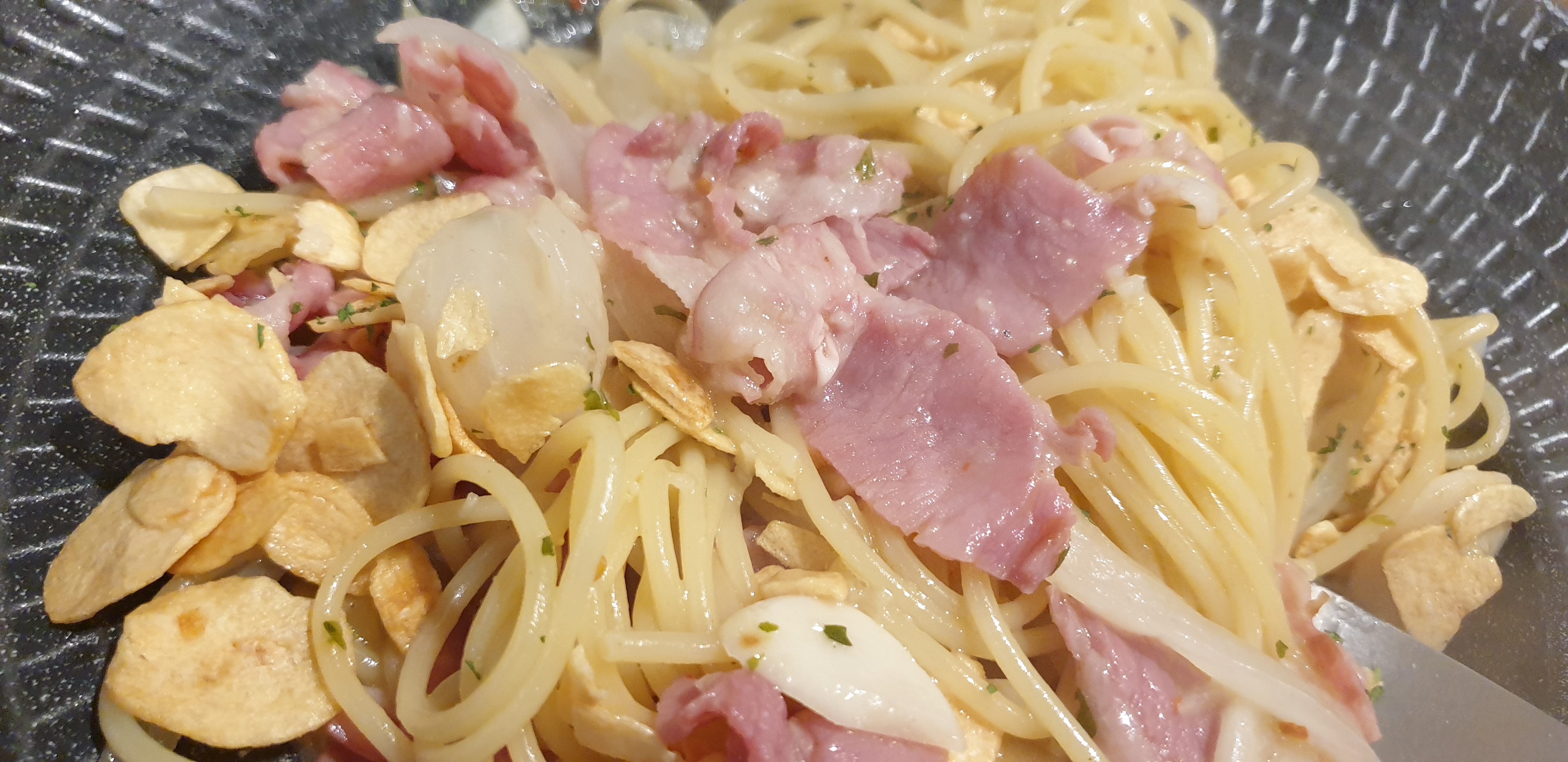 볶은 마늘과 튀긴 마늘 그리고 양파와 베이컨이 들어 있네요.