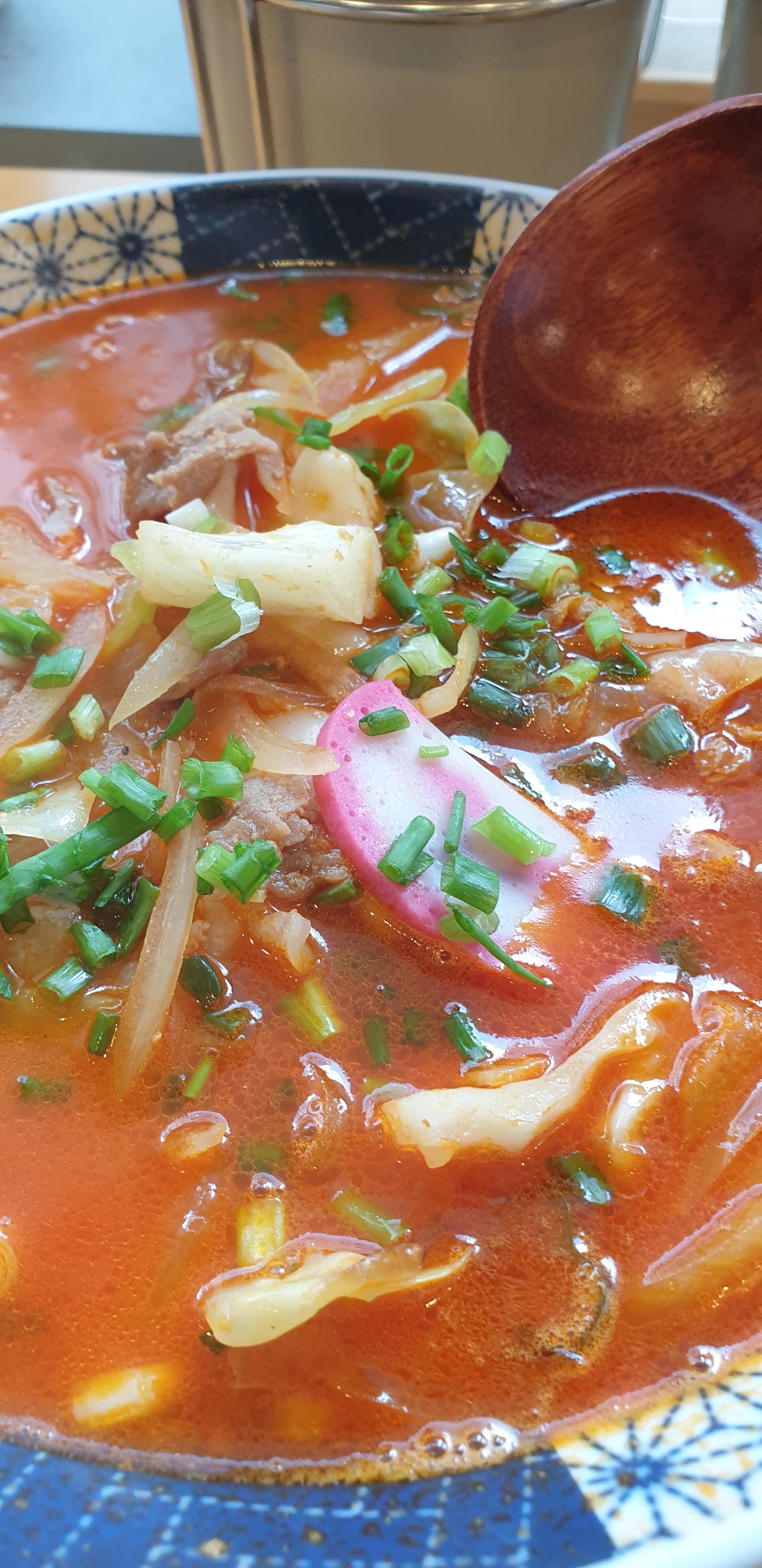 매운 숯불 부타 라멘은 겉보기에는 짬뽕같이 생겼네요. 분홍색 어묵? 같은 친구만 아니었으면 라멘인지 모를 것 같은 비주얼입니다.
