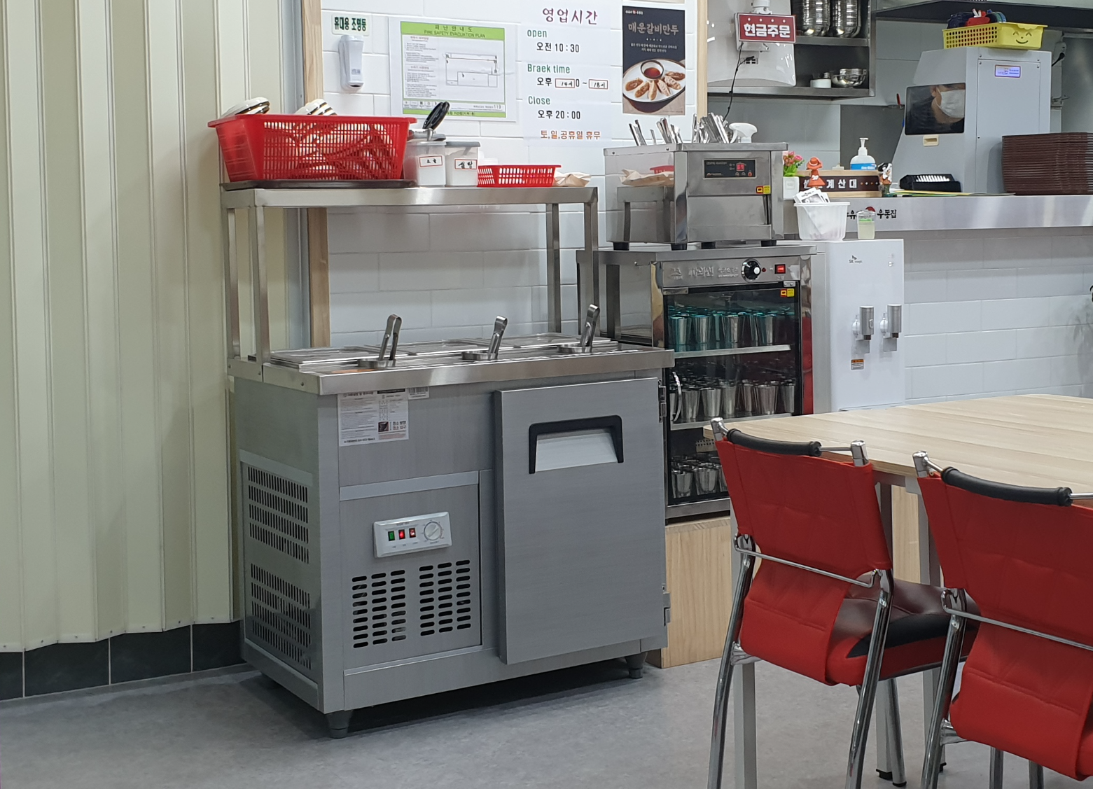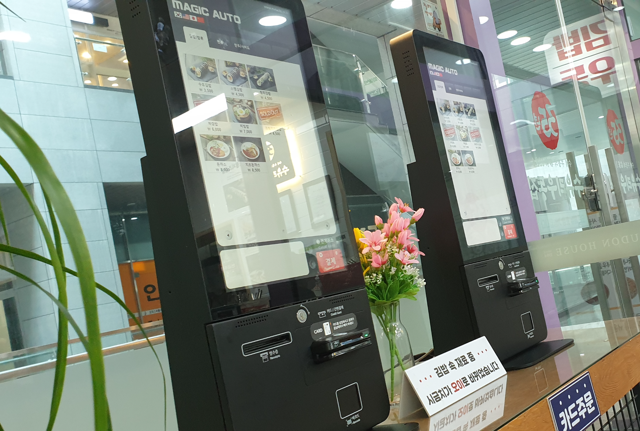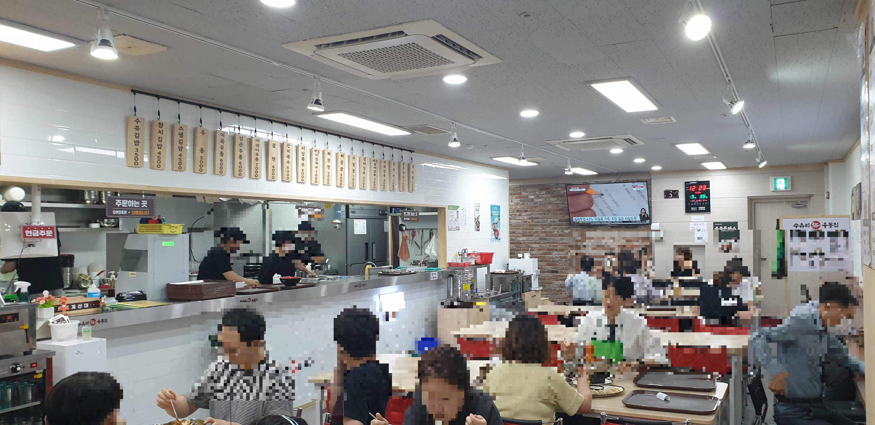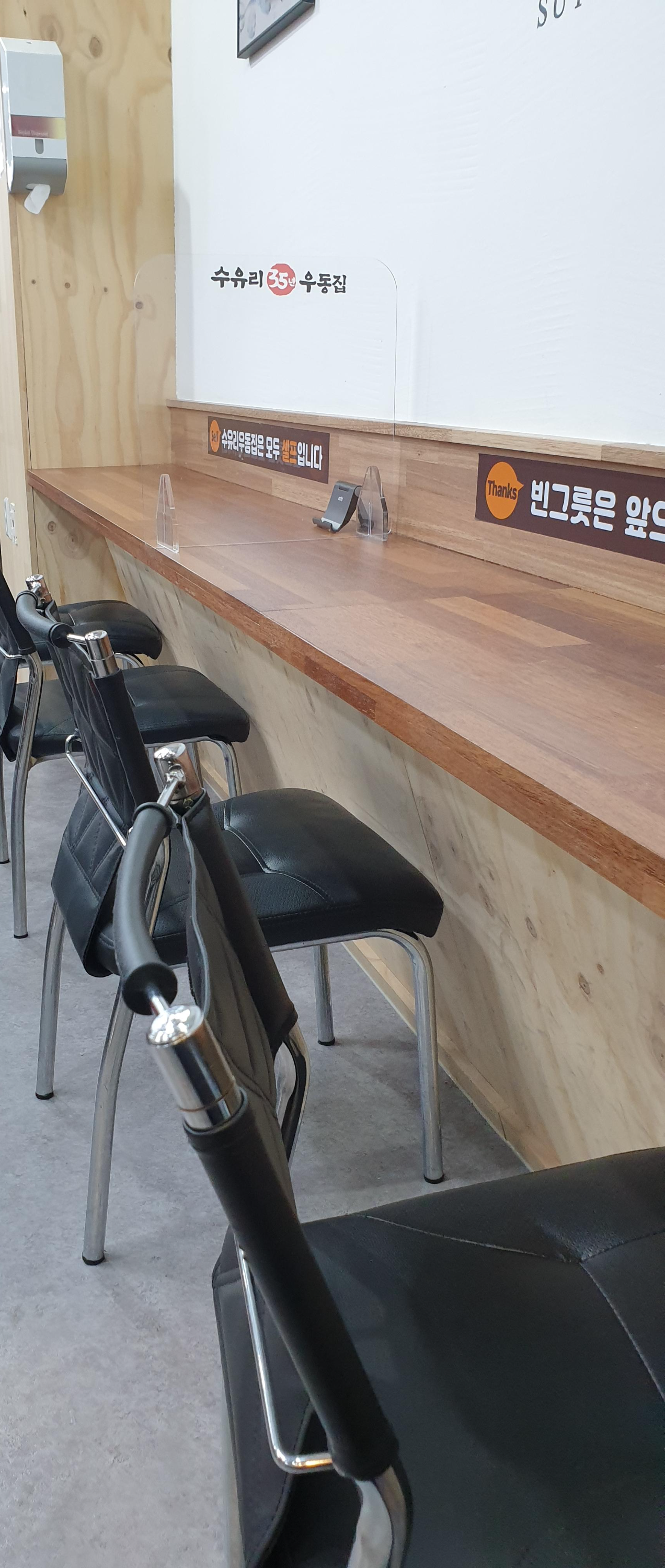내부엔 벽보고 앉을수 있는 자리도 있고 일반 테이블 자리도 있네요. 푸드코트처럼 키오스크로 주문하고 시계 옆에 보이는 LED에 번호 표시되면 음식을 직접 받아오는 시스템입니다.