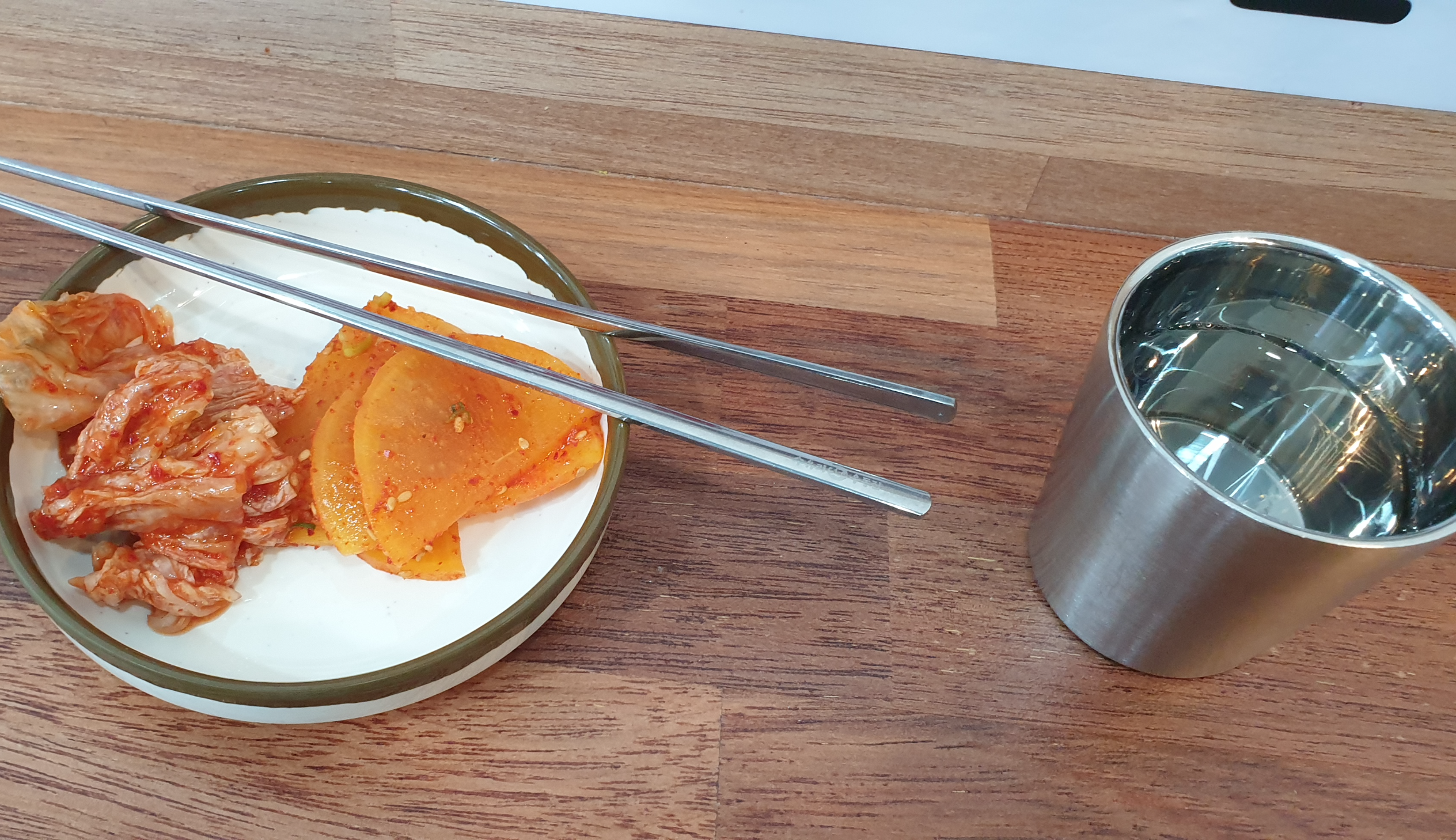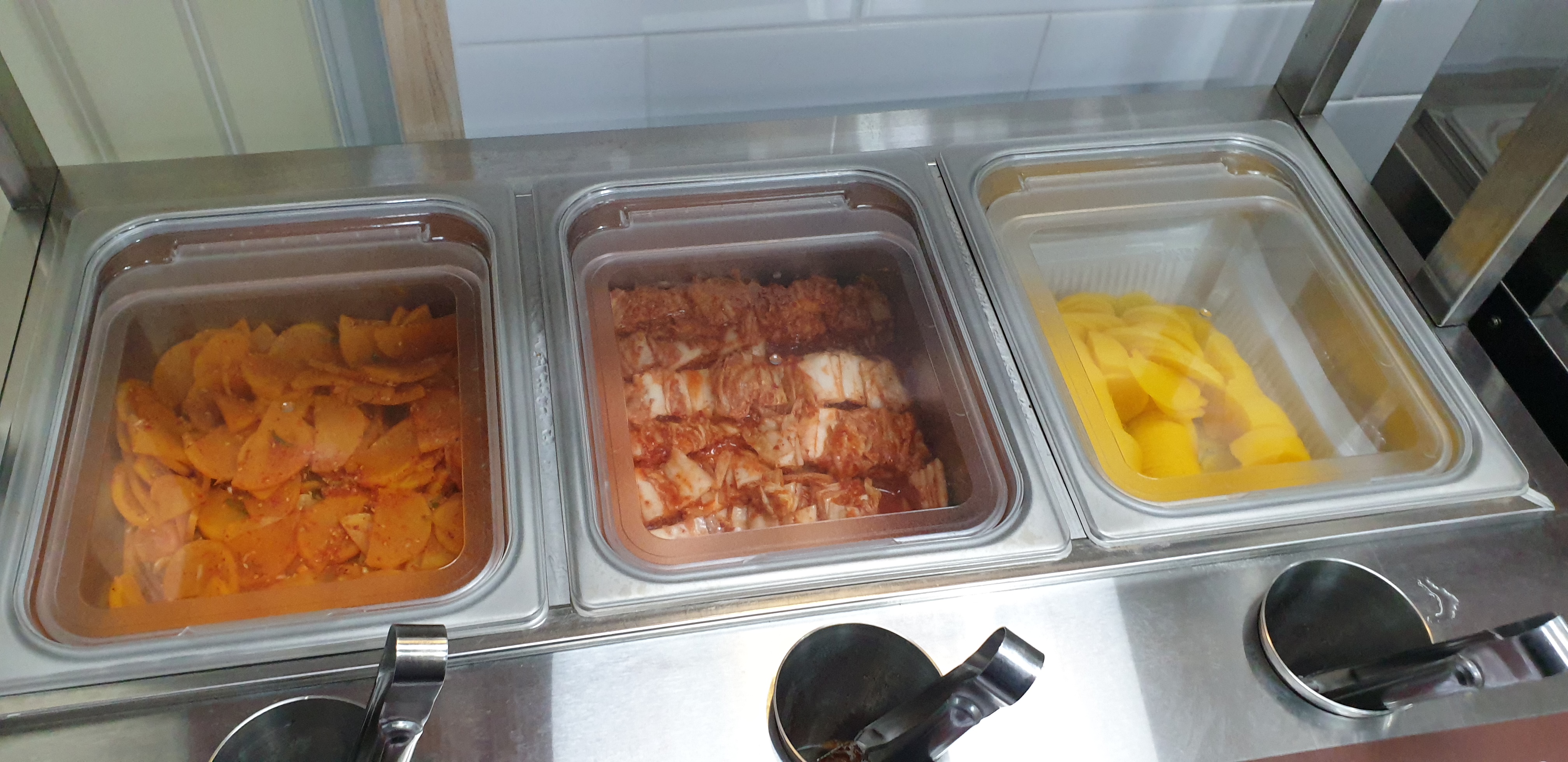 반찬은 단무지, 양념단무지, 김치가 있네요. 다른 건 다 괜찮았지만 수저가 약간 덜 세척된? 느낌의 자국이 있는 것들이 조금 있더군요.
