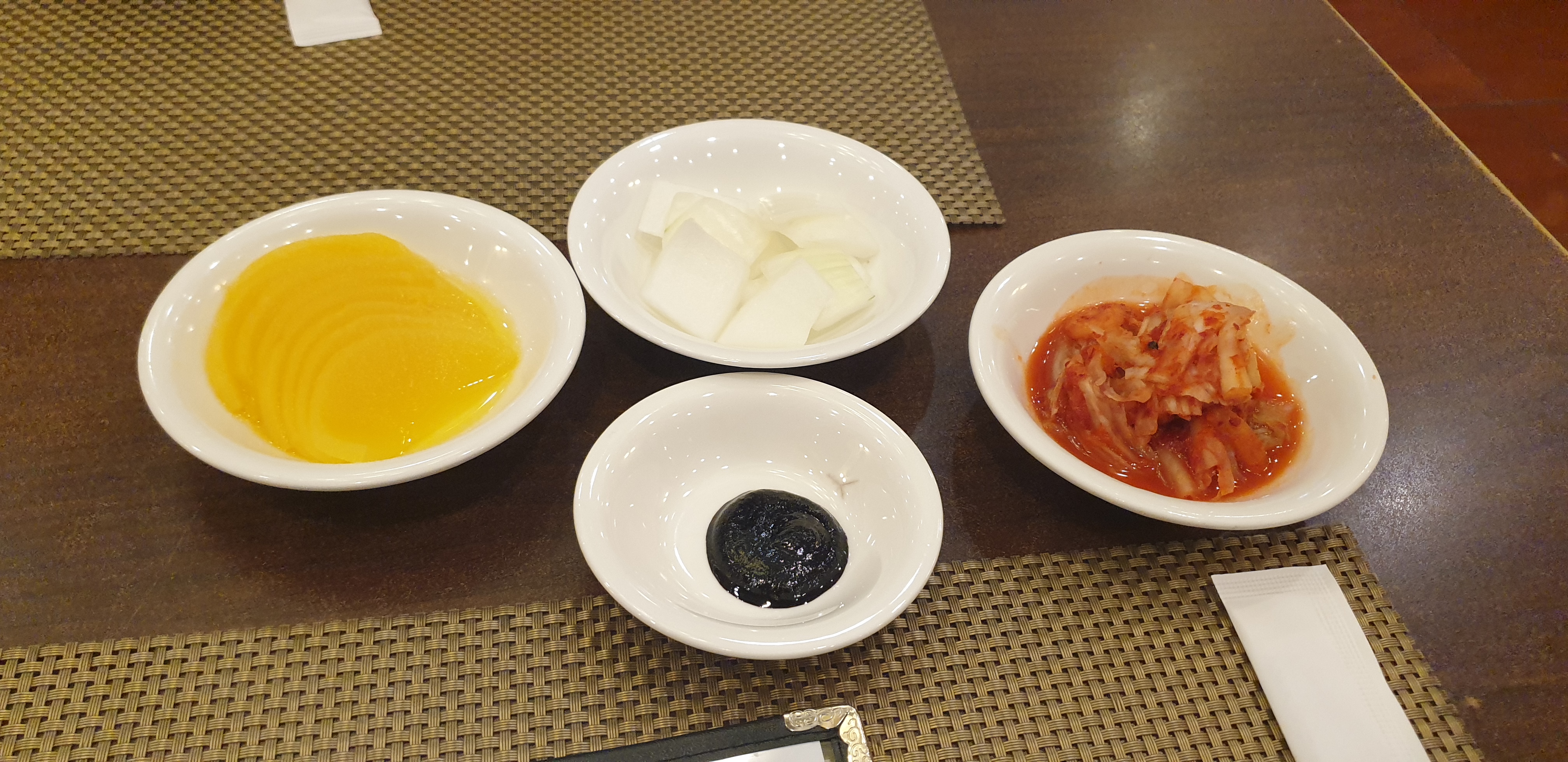 양파와 김치, 단무지, 춘장이 반찬으로 나옵니다.
