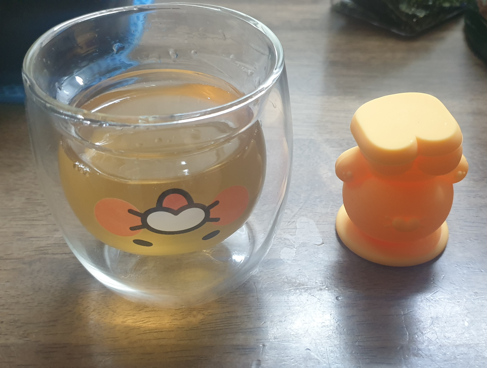 춘식이 색상에 어울릴 거 같아서 보리차를 따라봤는데 색이 잘 어울리네요.