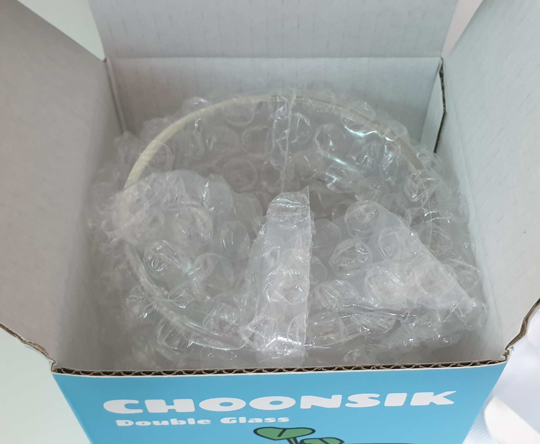 이쁜 박스에 고무줄 리본으로 꾸며져 있고 유리컵은 뽁뽁이로 포장되어있습니다.