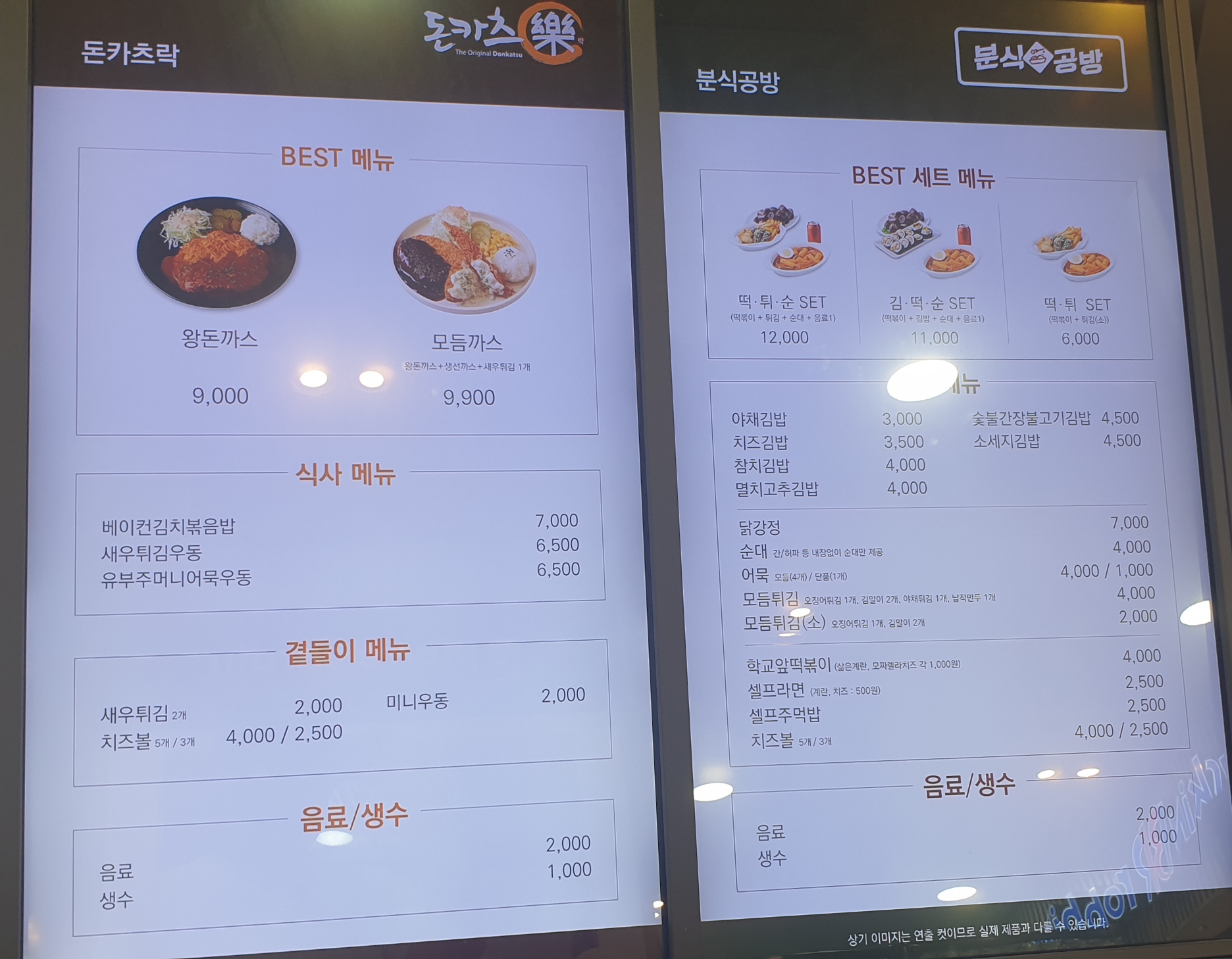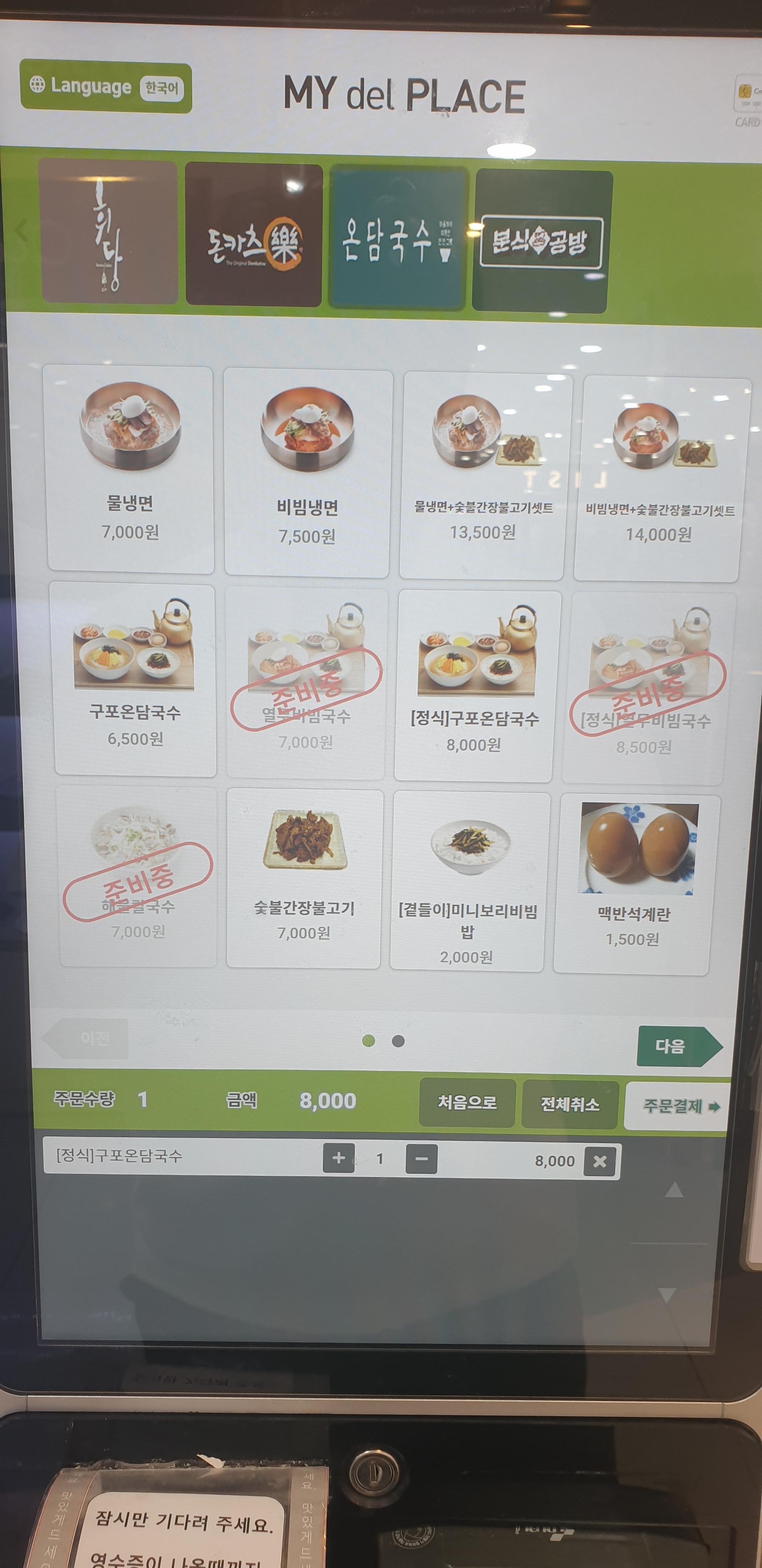 푸드코트 키오스크에서 휘당, 온담 국수, 돈카츠 락, 분식 공방의 메뉴를 주문할 수 있습니다.