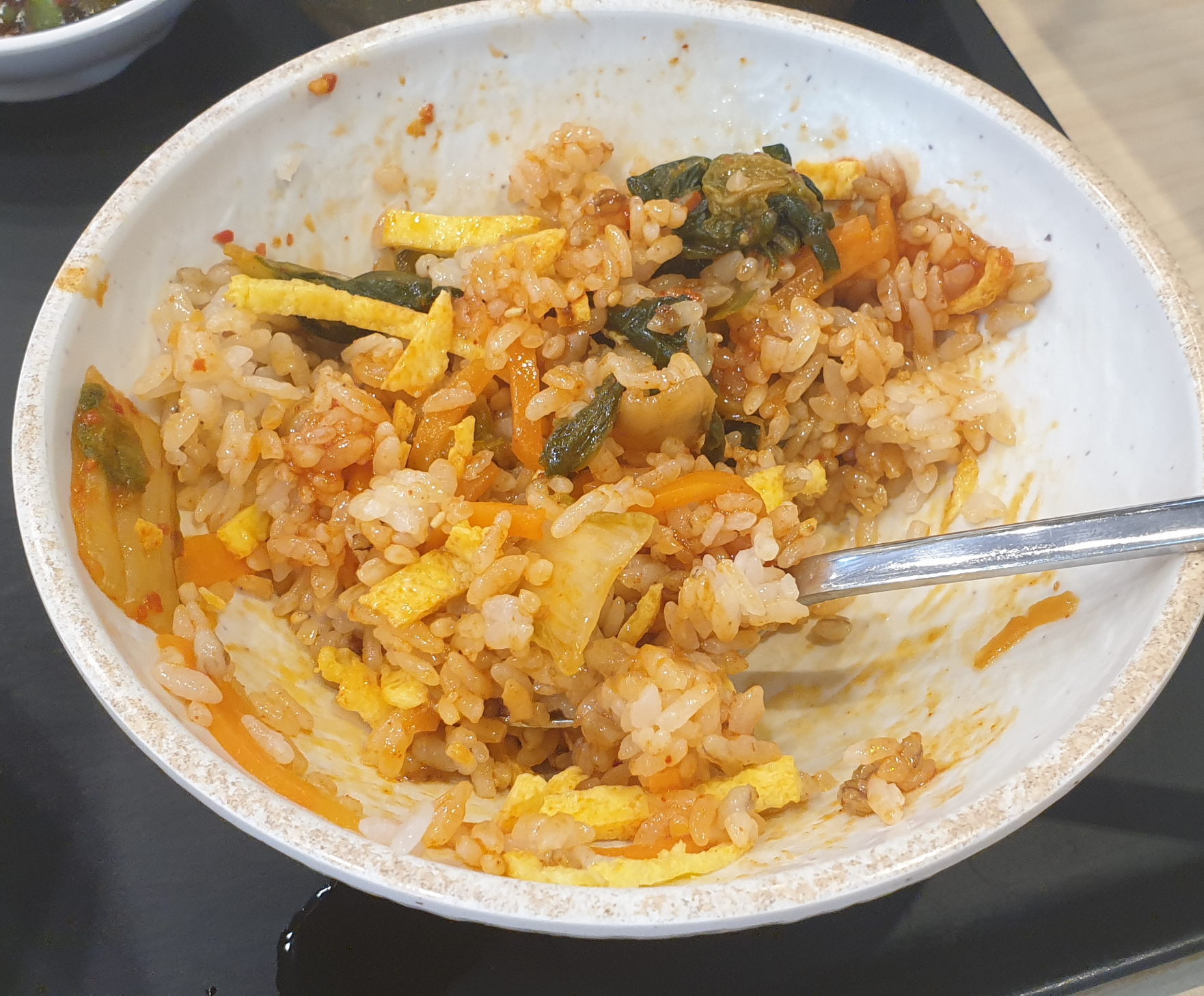 메뉴판에는 열무 보리비빔밥이지만 열무 대신 얼간이 김치이고 밥도 보리가 아니라 쌀밥이네요. 그래도 참기름 고소한 맛도 좋았고 비빔밥도 전체적으로 맛있었습니다.
