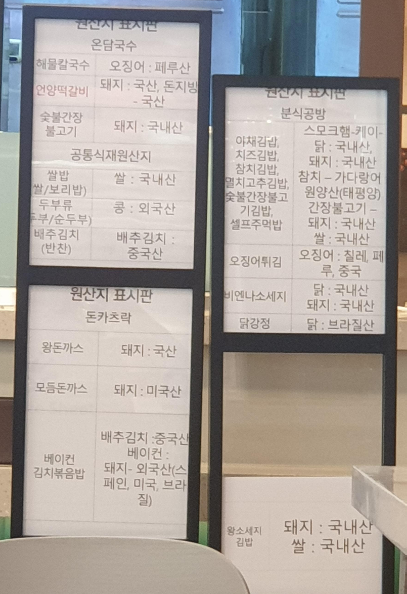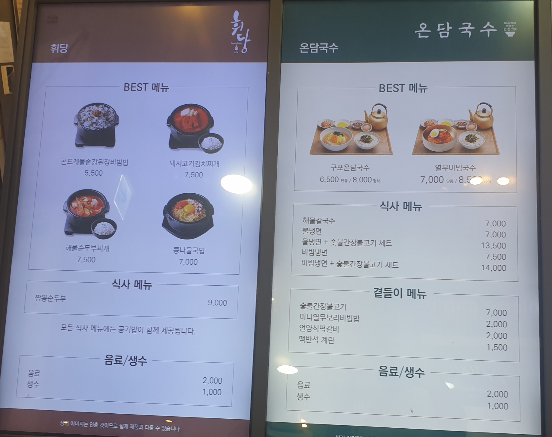푸드코트 키오스크에서 휘당, 온담 국수, 돈카츠 락, 분식 공방의 메뉴를 주문할 수 있습니다.
