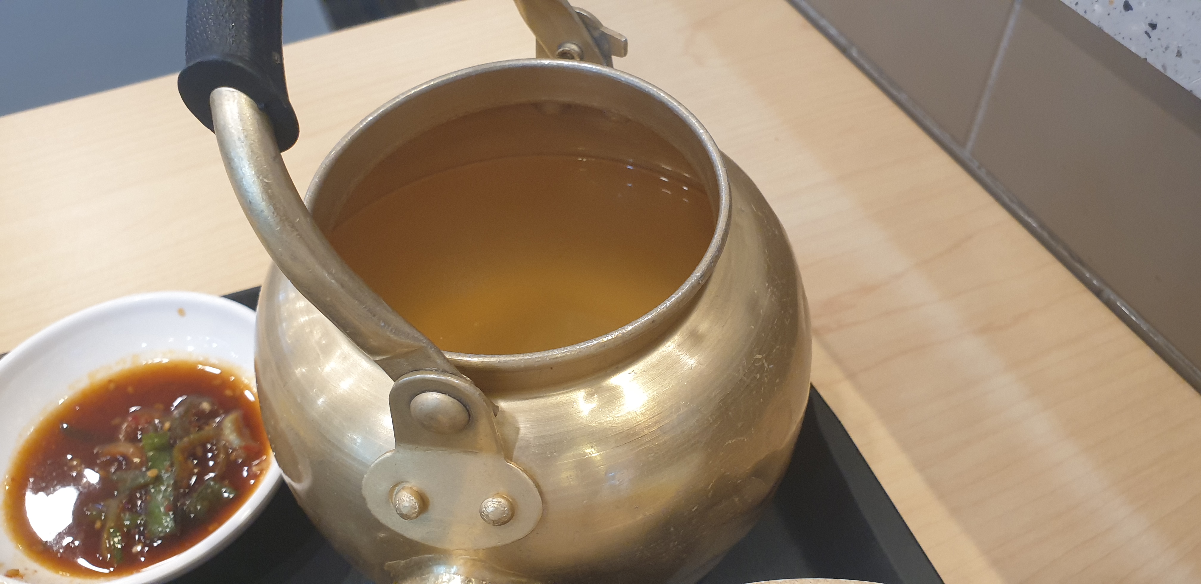 김치와 단무지 그리고 국수에 첨가할 간장이 반찬으로 나옵니다. 그리고 특이하게 국수 국물이 주전자로 따로 나오네요.