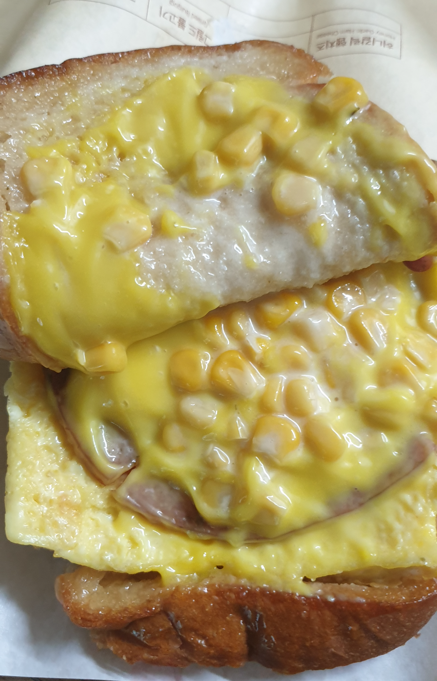 콘 시즈닝, 콘, 콘버터 소스, 스테이크 햄, 계란, 모짜렐라 치즈가 들어가고 빵은 브라운 브레드라고 합니다.
