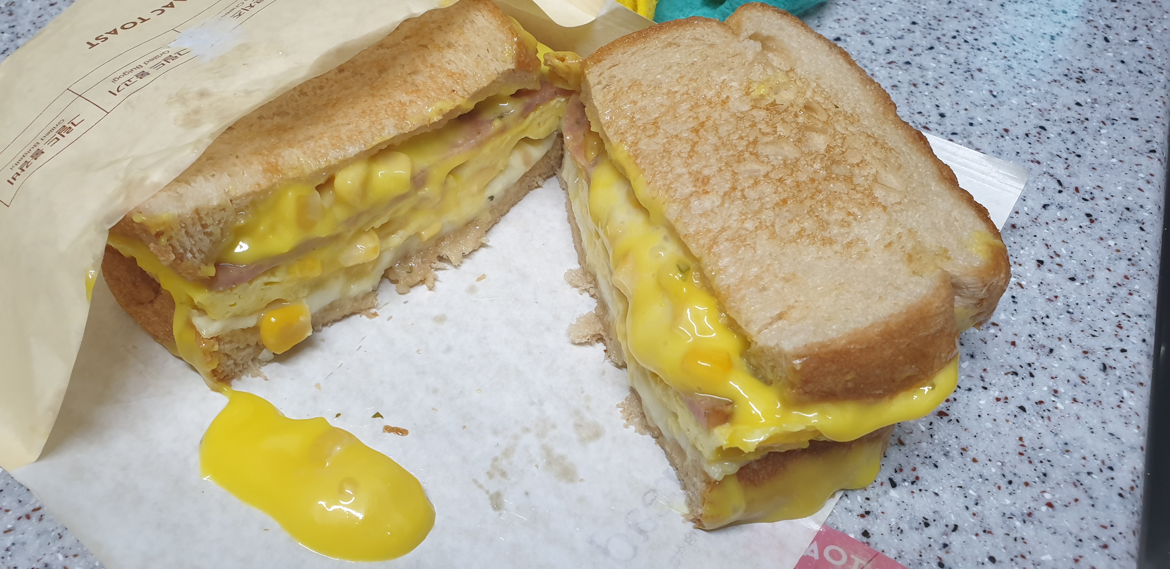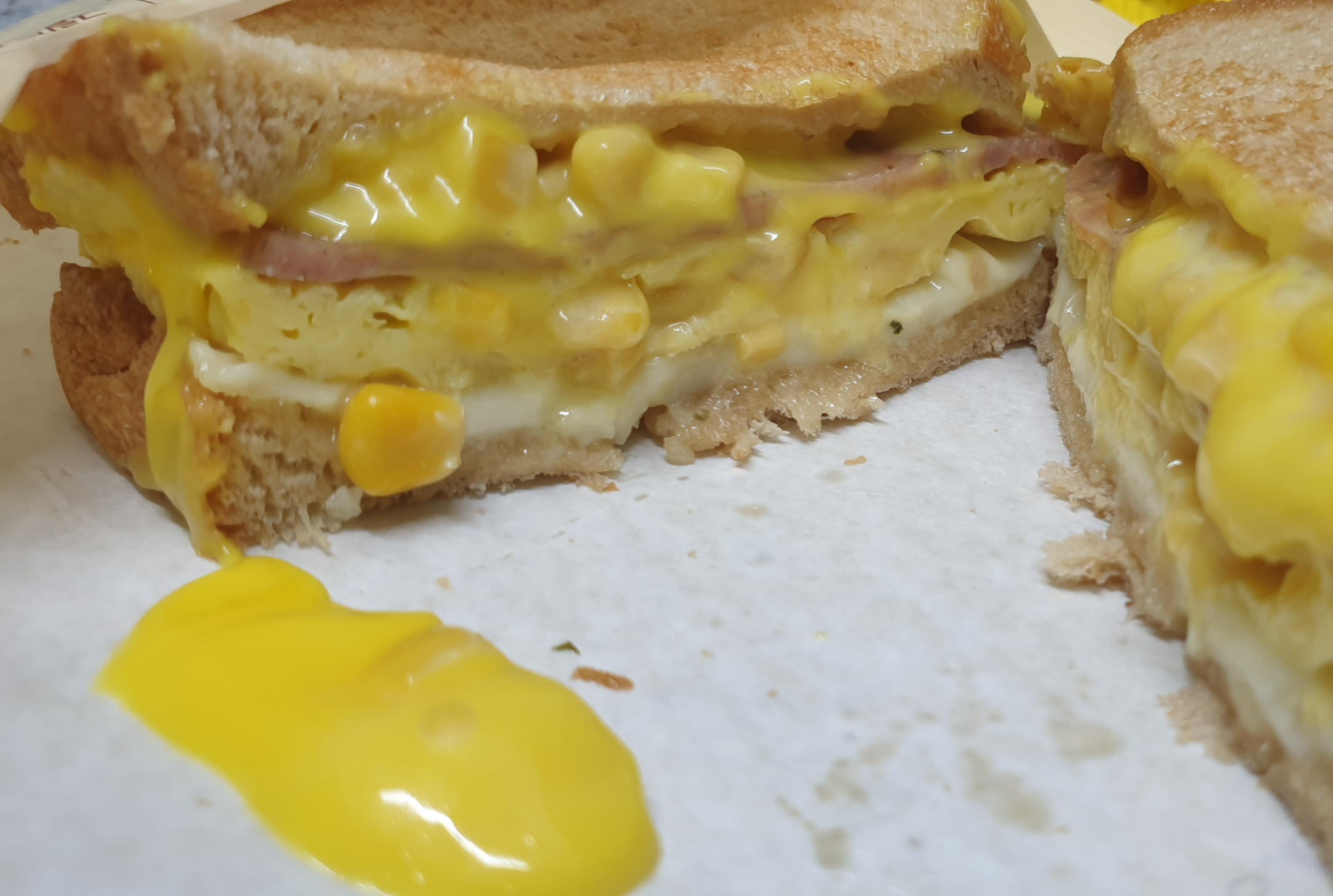 콘 시즈닝, 콘, 콘버터 소스, 스테이크 햄, 계란, 모짜렐라 치즈가 들어가고 빵은 브라운 브레드라고 합니다.