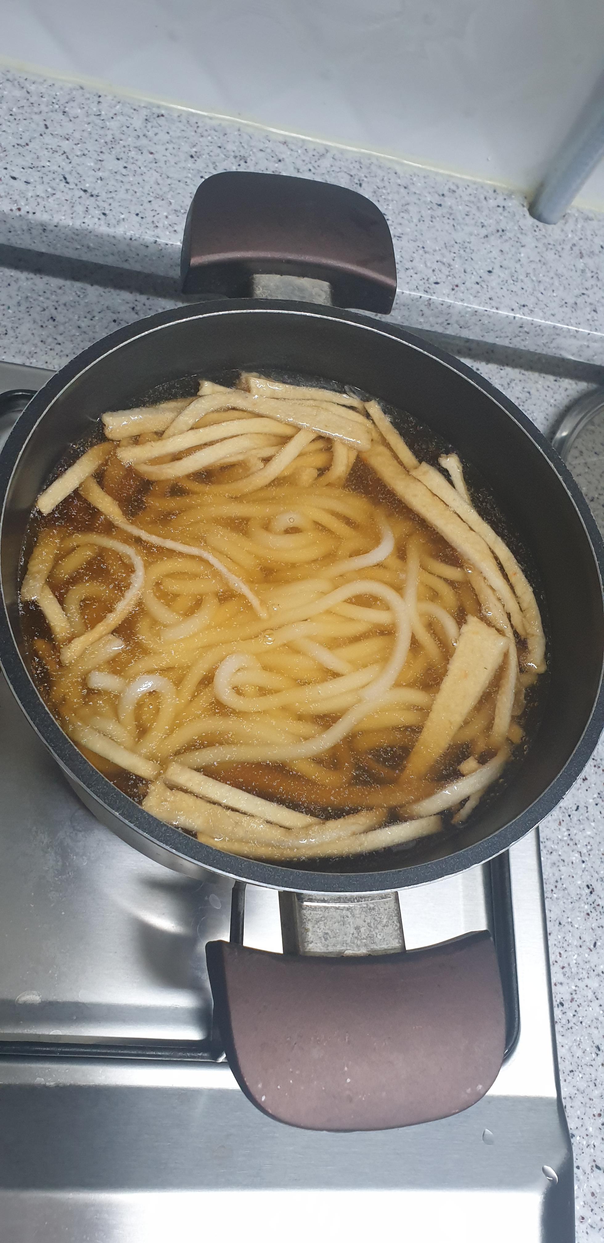 맛은 평범한 우동 맛이었습니다. 우동면하고 면이 둘 다 기다래서 먹기 편하더군요...