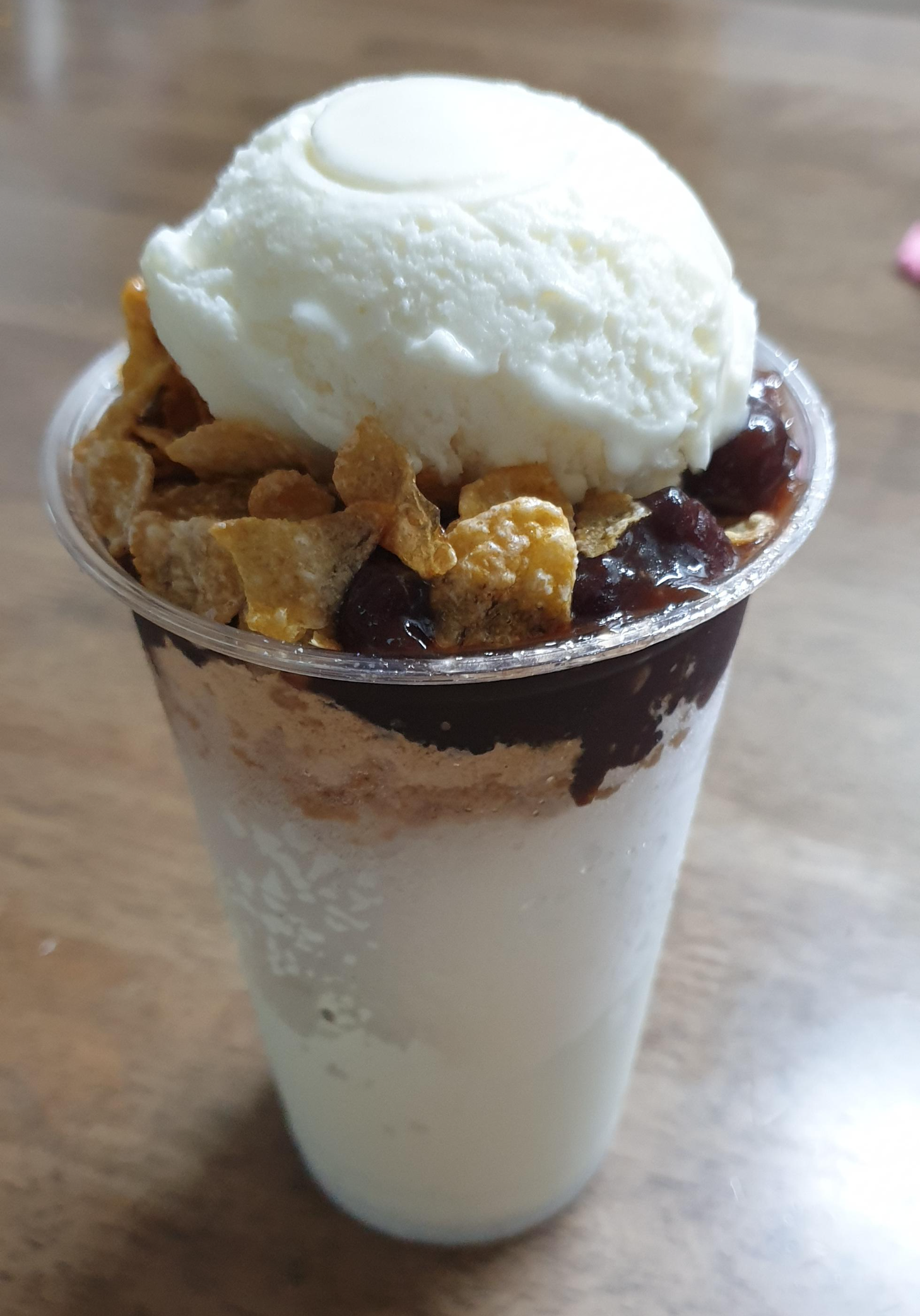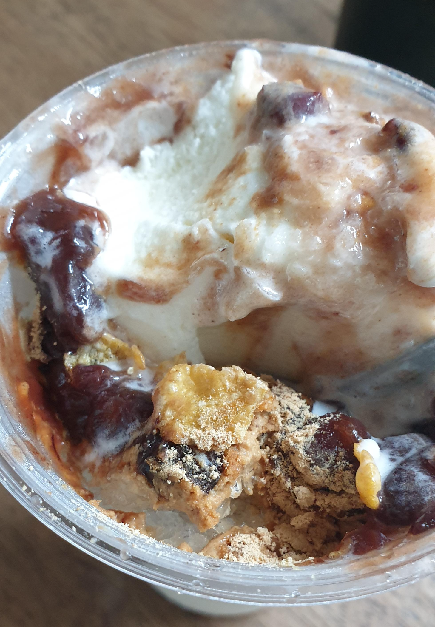 위에는 바닐라 아이스크림 그리고 시리얼도 보이고 팥도 보이고 그다음에는 미숫가루처럼 보이는 갈색 가루도 있네요. 중간엔 일반 얼음 간 게 보이고 가장 아래에는 연유가 보이네요.