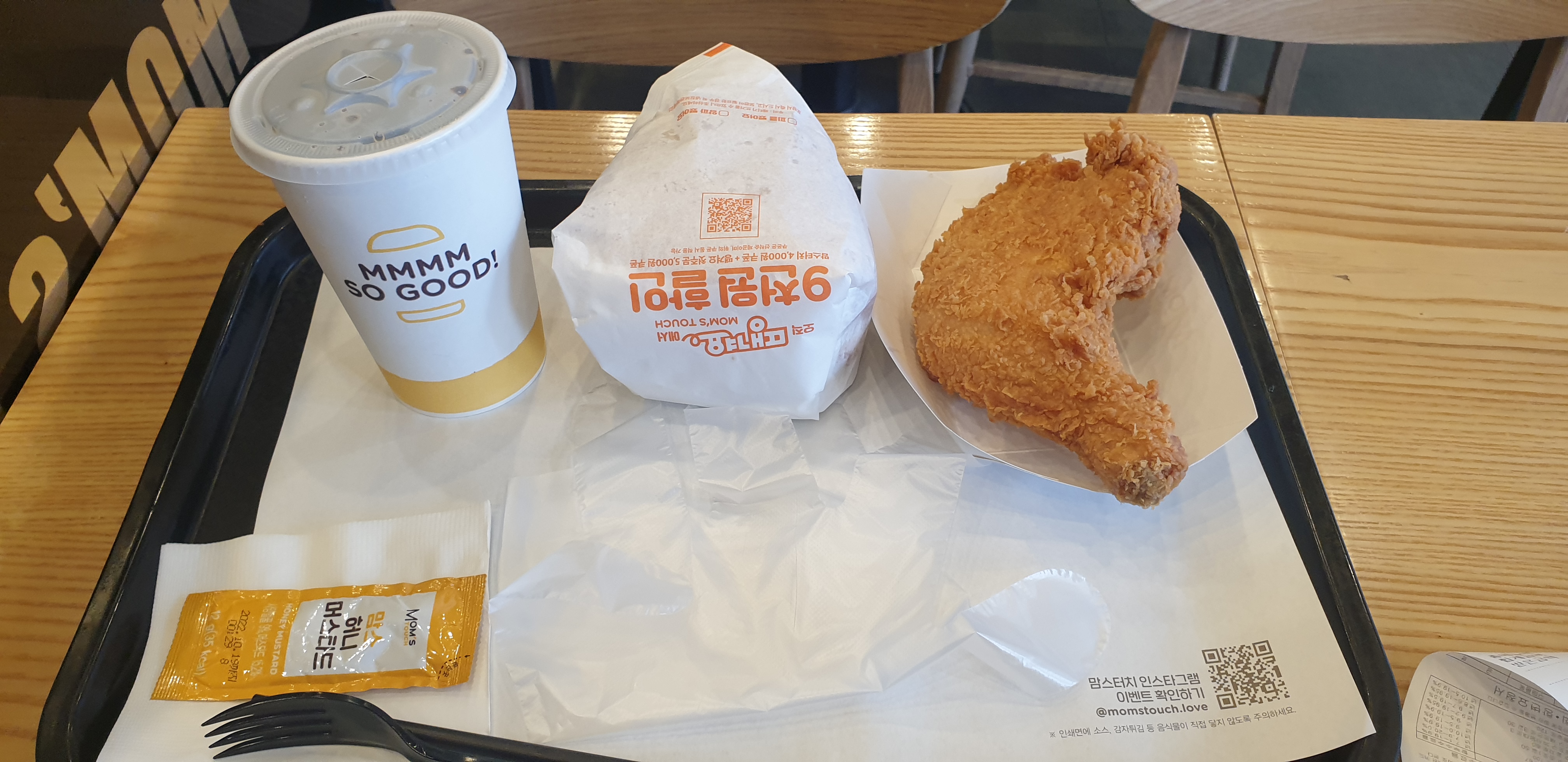 후라이드 통다리가 4,100원 그리고 싸이 버거가 단품이 4,100원 이니깐 8,200원 남는 금액은 1,100원이고 콜라 가격인 셈이네요. 머스터드와 포크를 같이 주시더군요.