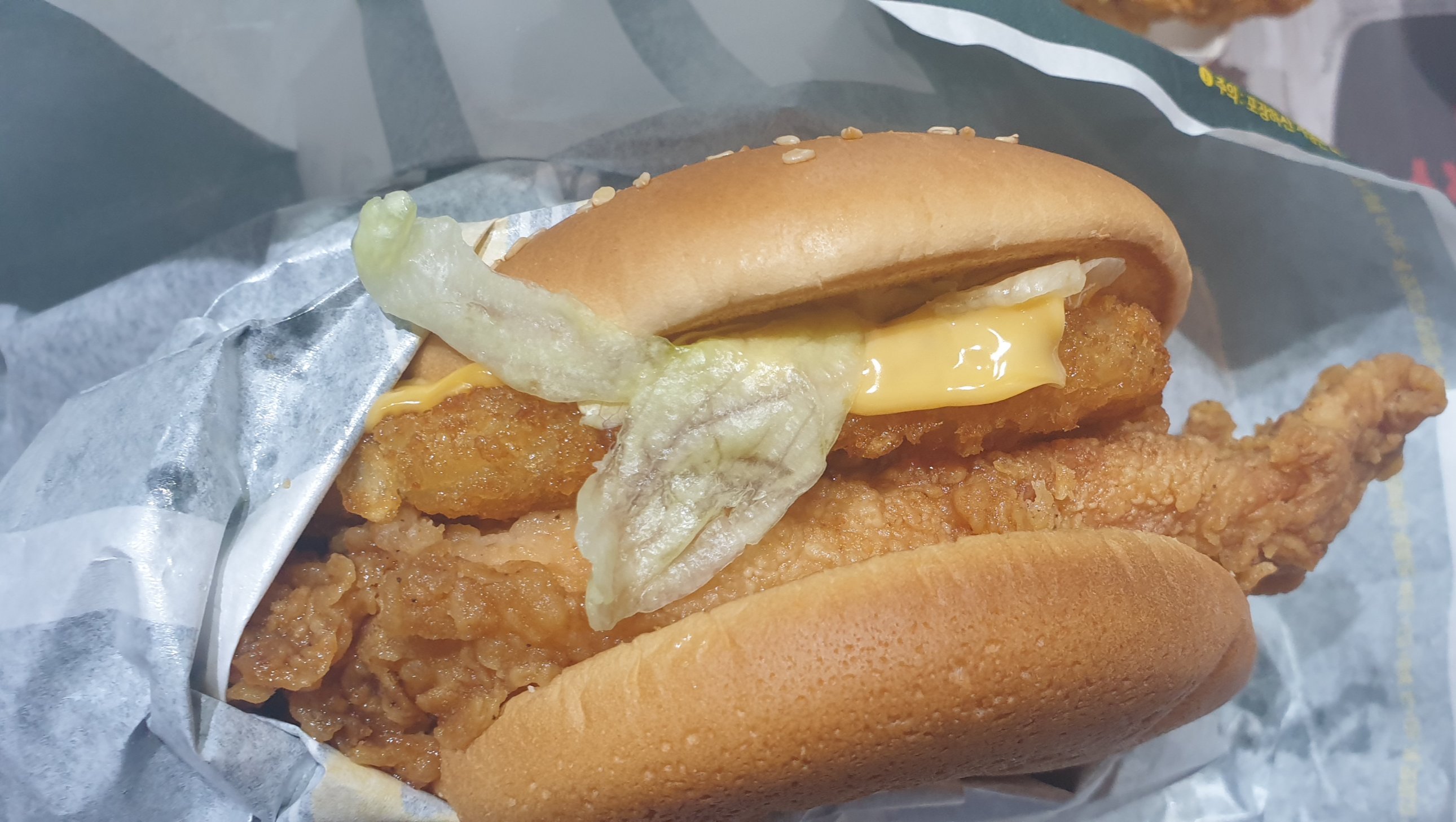 양상추 조금과 치즈, 해쉬브라운 감자와 가슴살 패티가 들어있네요. 케첩과 마요네즈도 들어있습니다.