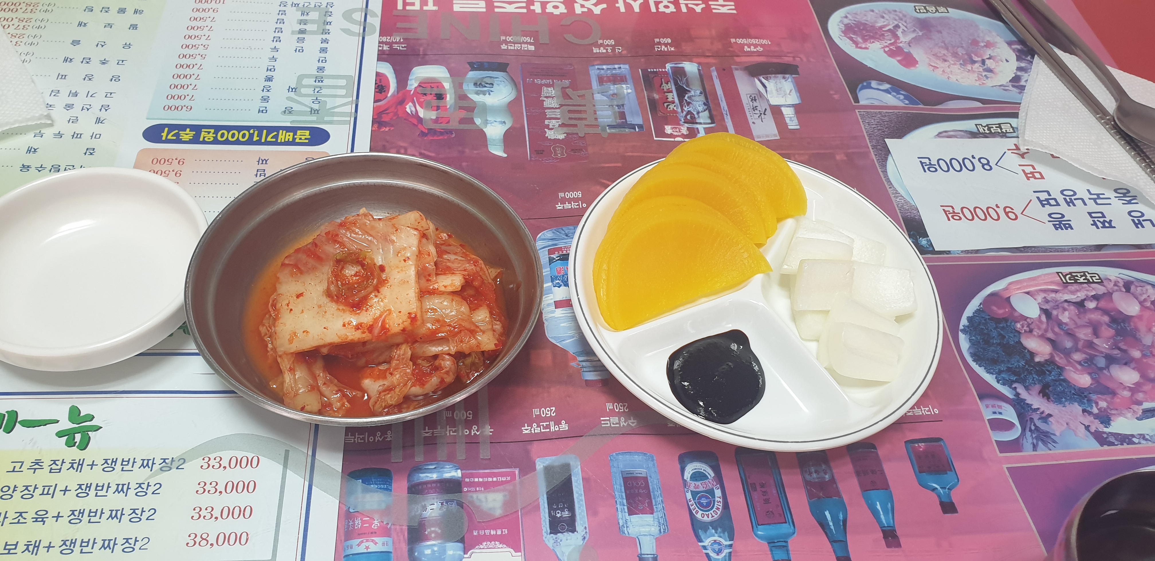 반찬으로는 김치와 단무지, 양파, 춘장이 나옵니다.