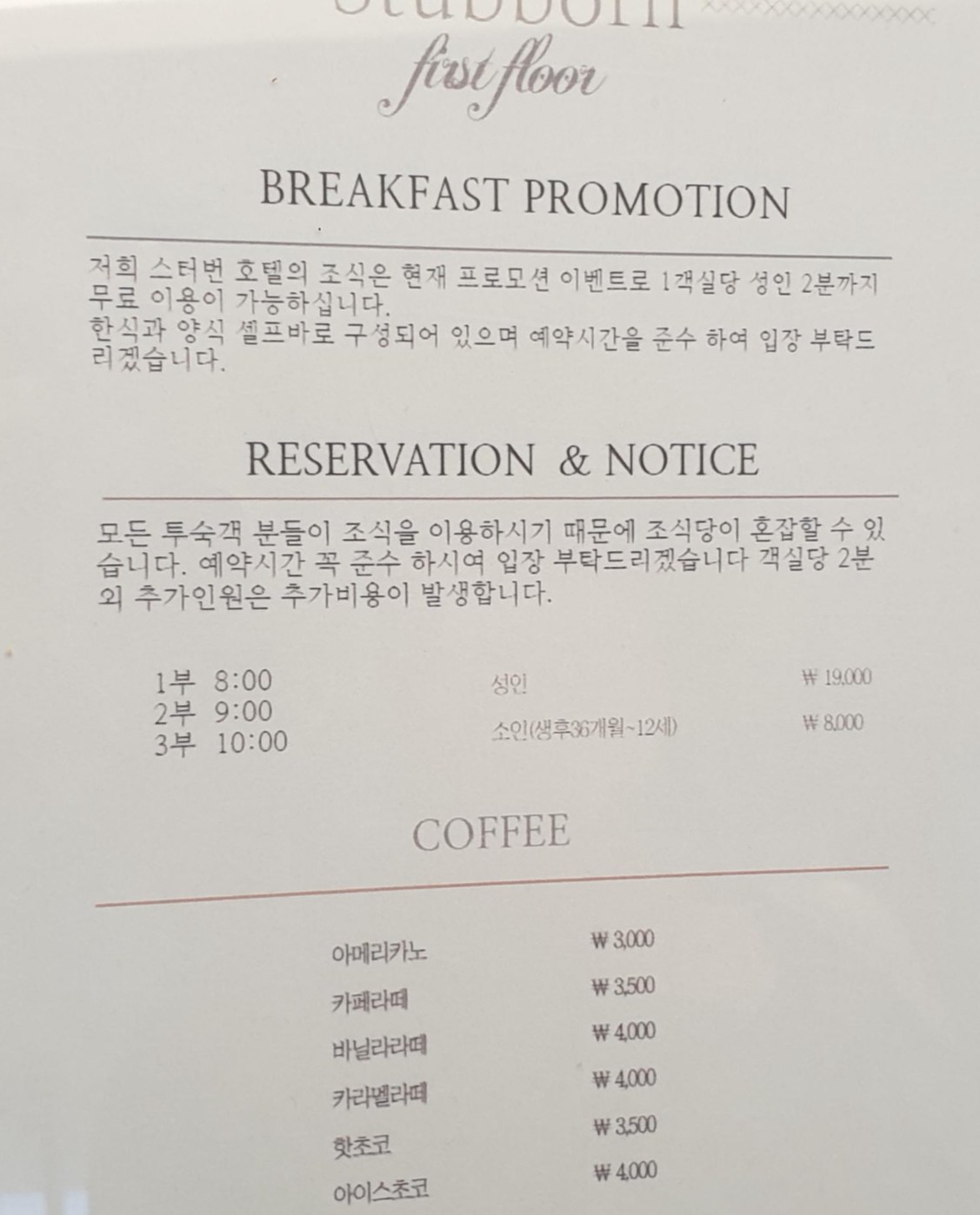 언제까지 할지는 모르지만 스터번 호텔은 각 객실당 성인 2명까지 조식을 무료 이용할 수 있다고 합니다.