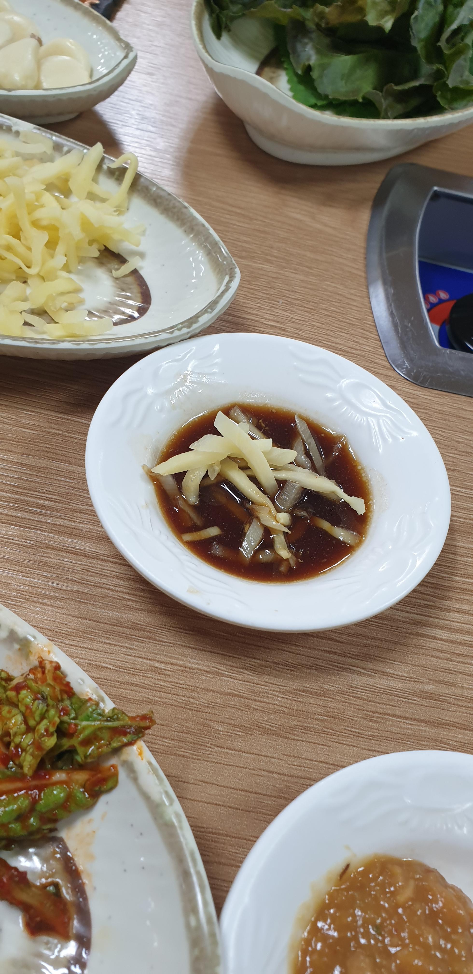 반찬은 생강, 마늘, 상추, 깻잎 그리고 겉절이? 가 나옵니다.