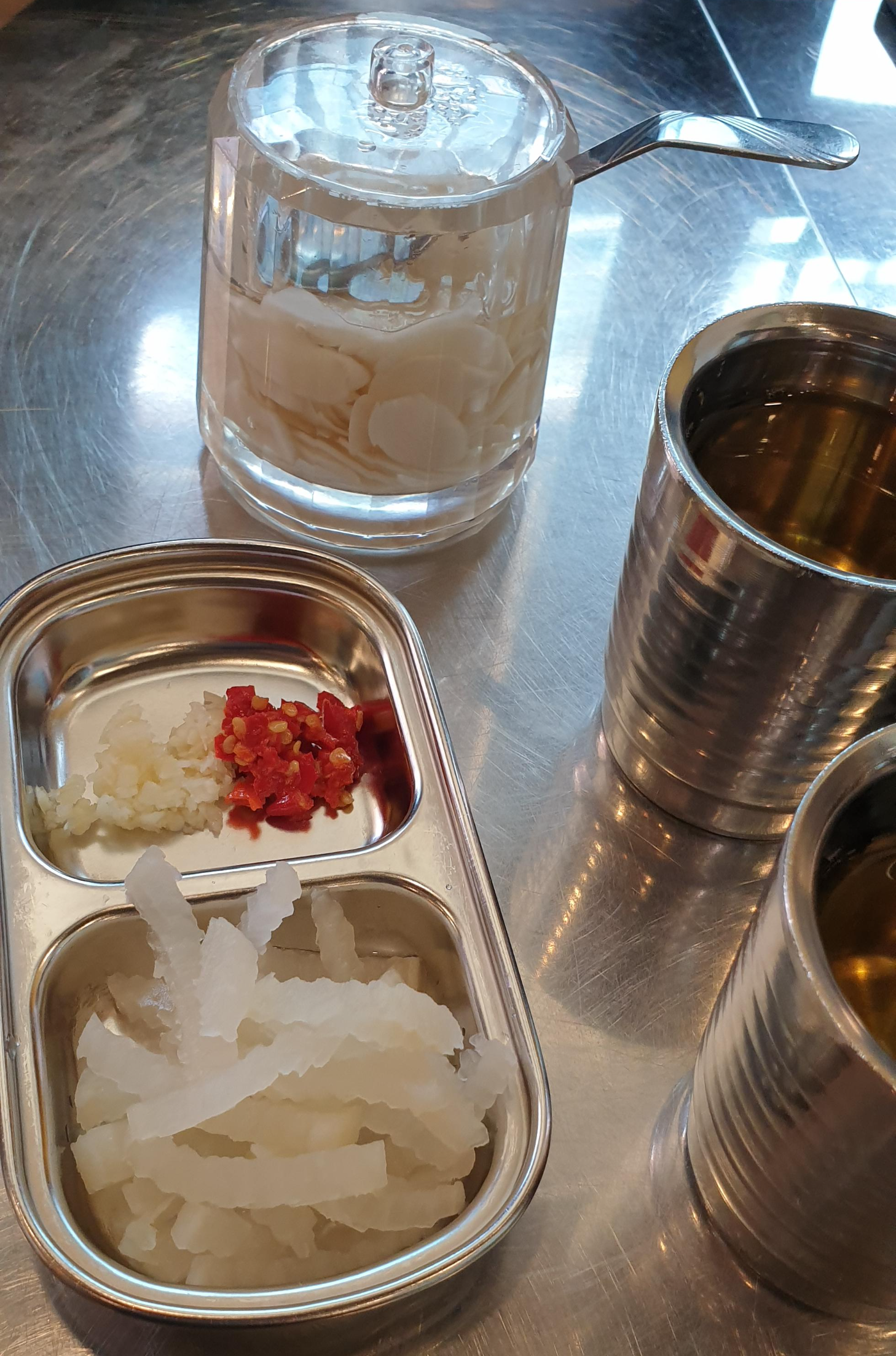 반찬으로 무 피클? 같은 게 있네요. 그리고 마늘 다진 것과 고추 다진 것처럼 생긴 것도 있습니다.