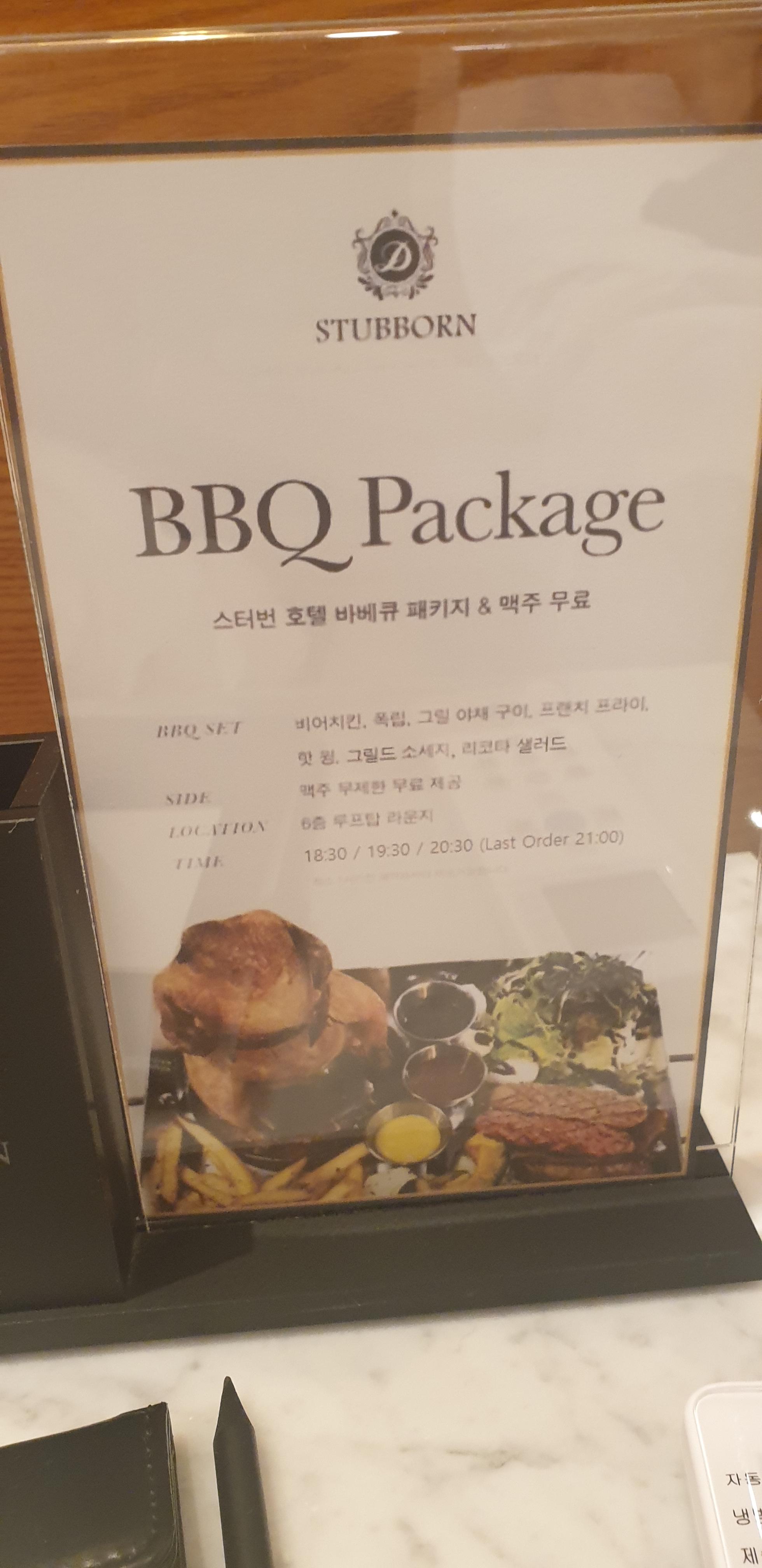 그리고 객실에도 안내가 있는 BBQ 패키지... 사실 구성이 그다지 끌리지는 않지만 옥상 루프탑 라운지에서 먹을 수 있습니다.