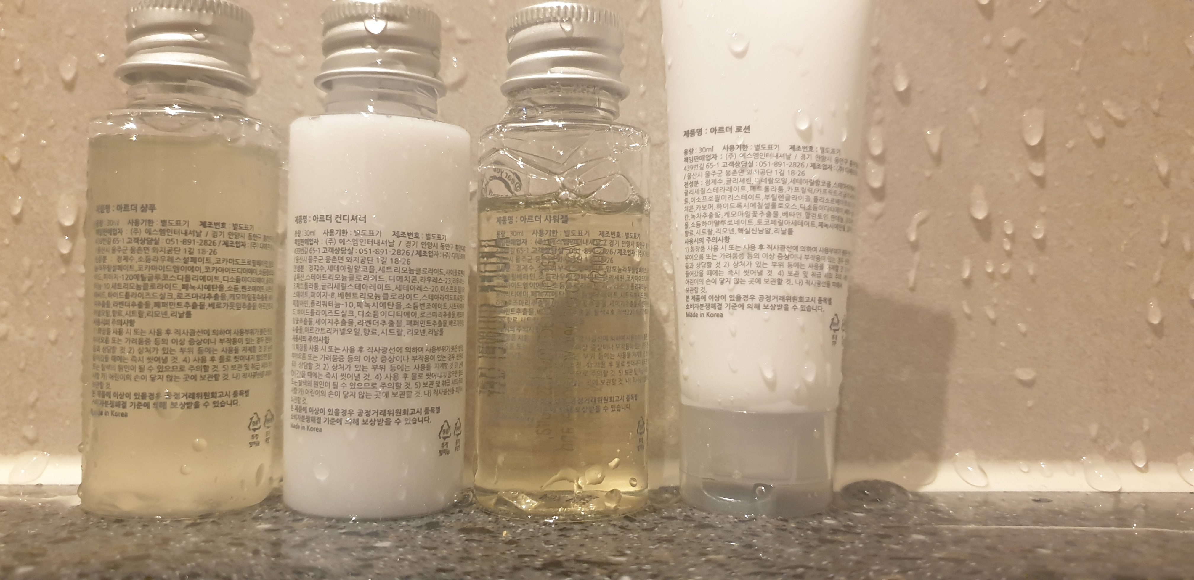 4 종류 다 아르더 제품이더군요. (인터넷에 호텔 어메니티 아르더 프리미엄 미니어처 샴푸라는 이름으로 팔고 있더군요.)