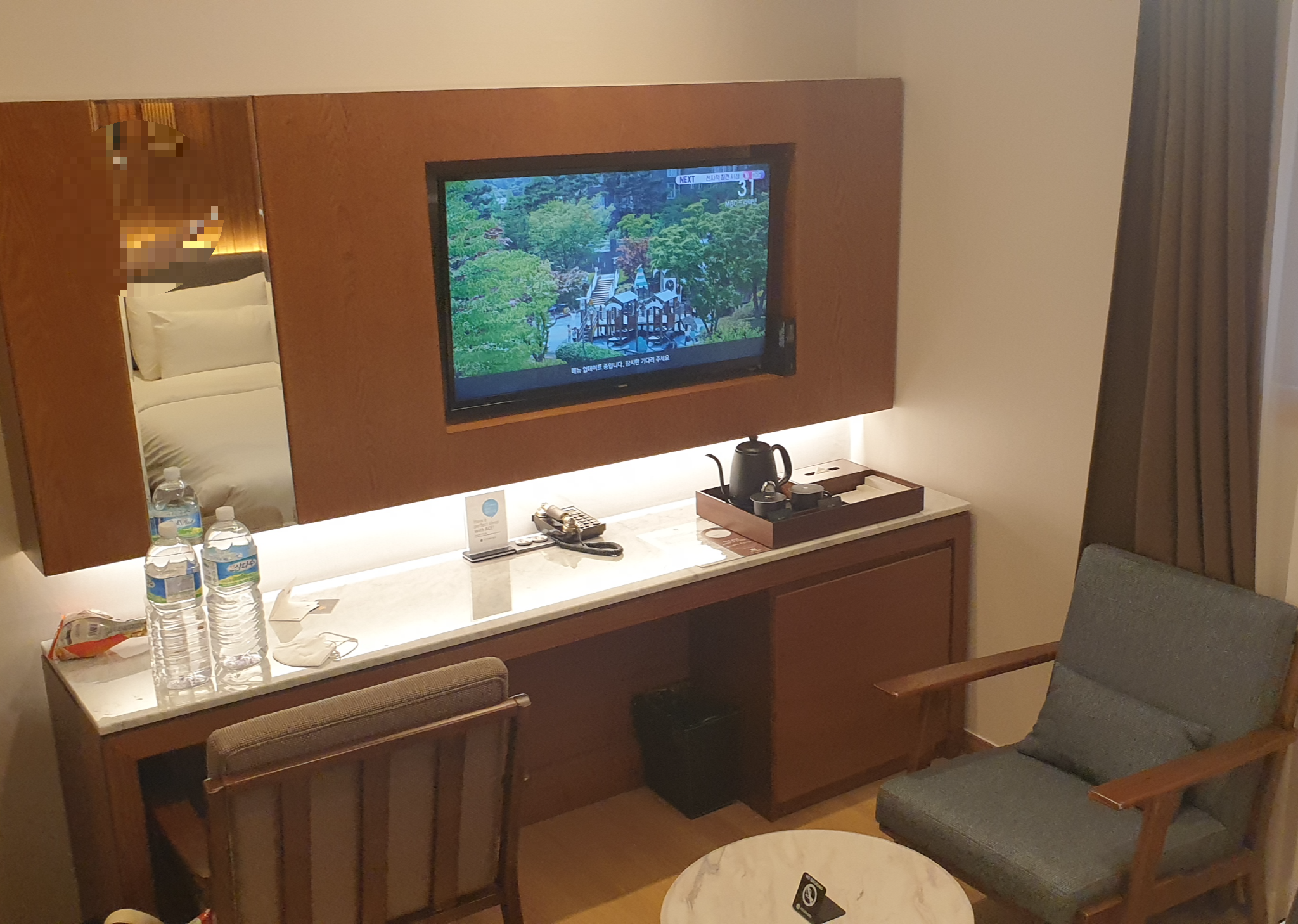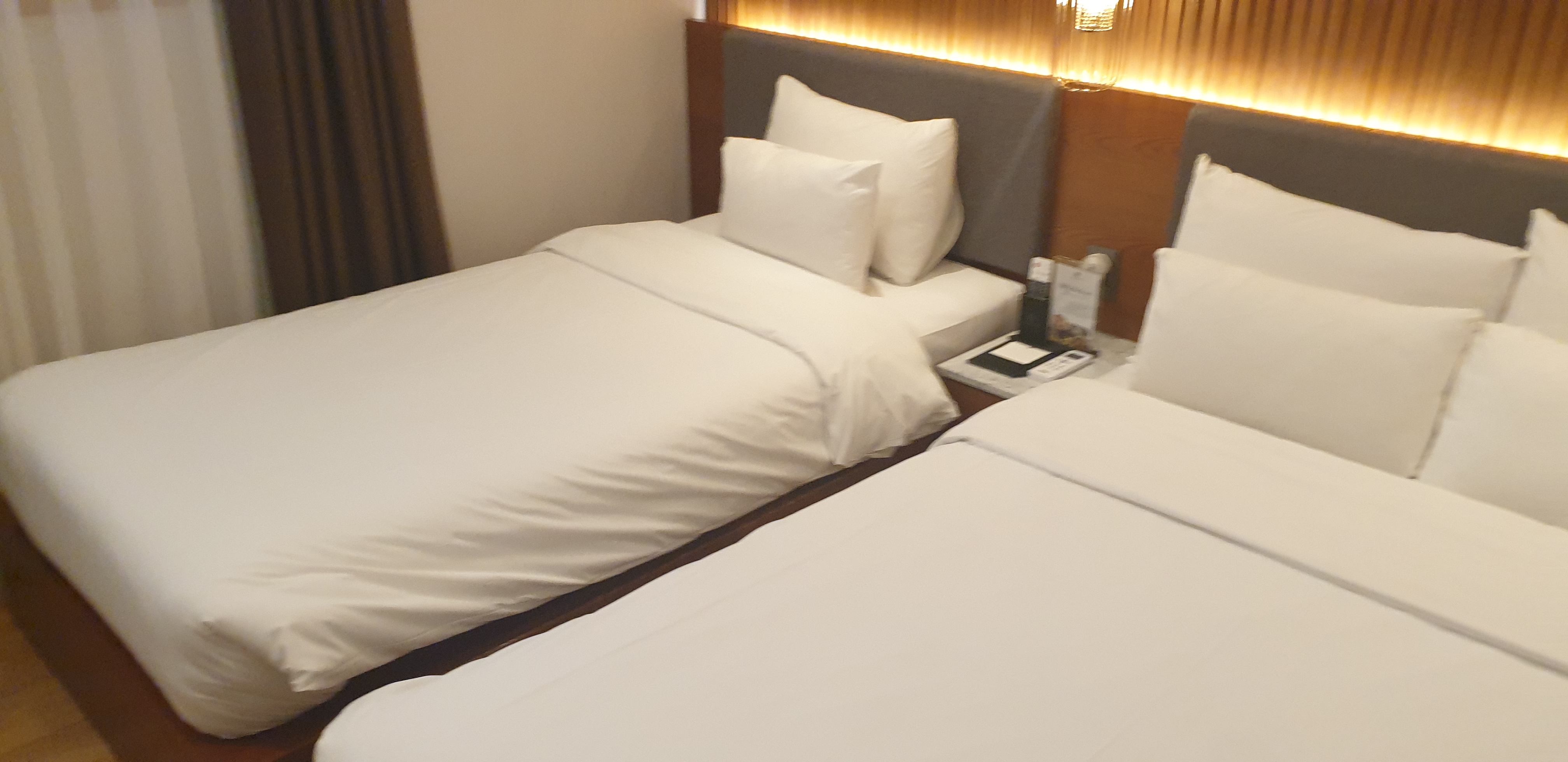 실내는 무척 좁습니다. 침대 싱글 한 개와 퀸 두 개로 꽉 차 있고 딱 침대 보이는 사진 저게 끝이죠. 방 크기에 실망하실 분도 계실 것 같아요. 앞에 조금의 공간에 의자와 TV가 위치해있습니다. 사실 크기만 보면 모텔보다 못하다고 느낄 수도 있을 것 같습니다. 에어컨은 캐리어 에어컨인데 금방 시원해지지는 않더군요. 그래도 외출할 때도 안 꺼지고 틀어놓고 나갈 수 있어서 켜놓고 해변 걷고 루프탑 갔다 오니깐 시원해져 있었습니다. 냉장고에는 작은 생수가 3개 들어 있었습니다.