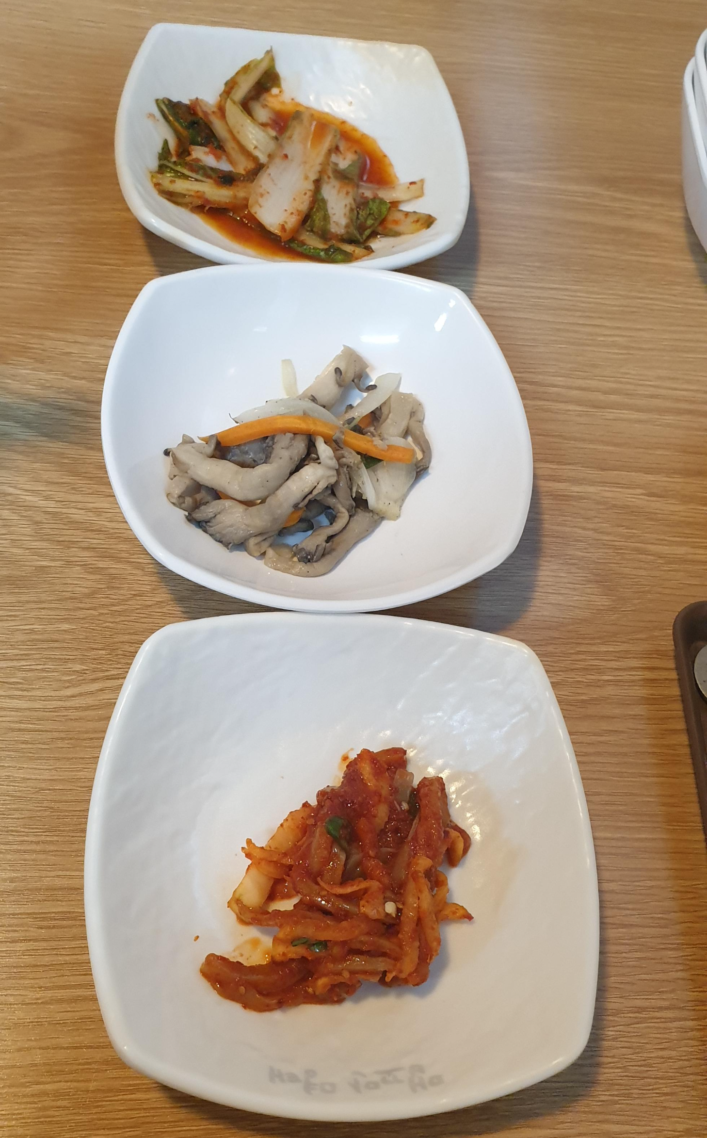 반찬은 버섯볶음과 오징어젓갈 그리고 얼간이? 김치가 나오는데 사실 맛을 떠나서 미리 상에 세팅해놓은 반찬들이라 미지근해서 더 맛없게 느낀 것 같습니다. 버섯은 괜찮았지만 김치, 젓갈은 차가워야지!라고 평소에 생각하는 저에겐 안 차가운 김치와 오징어 젓갈은... 아쉬웠습니다.