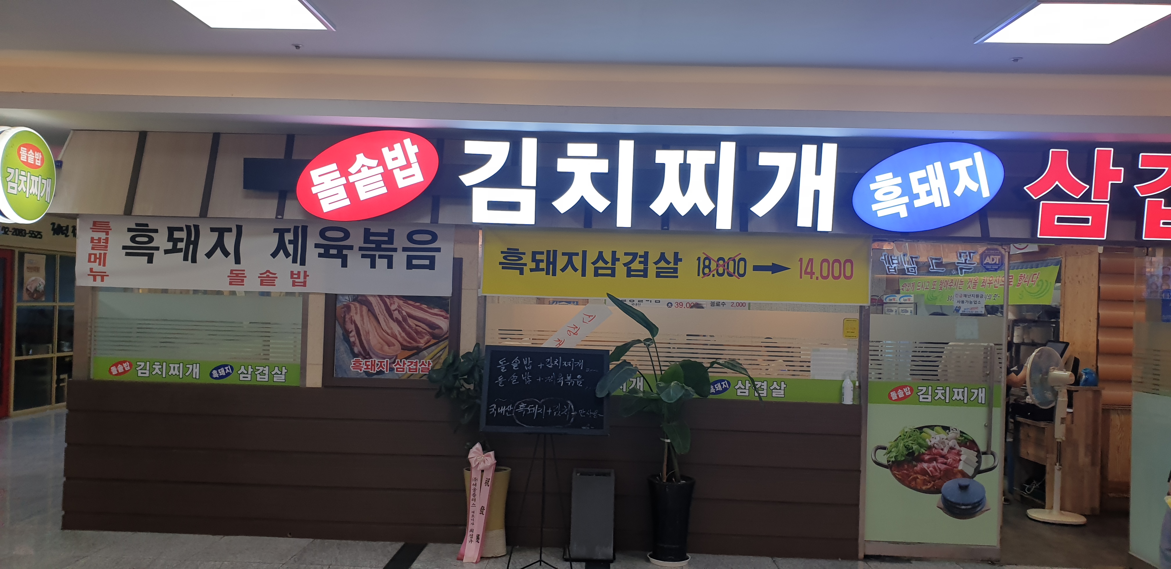 가산디지털단지 역과 연결되어있는 대륭포스트 6차 지하 1층에 위치한 돌솥밥김치찌개 흑돼지삼겹살이라는 식당에서 김치찌개를 점심으로 먹었습니다. 식당 이름이 뭘 파는지를 다 알려주네요.