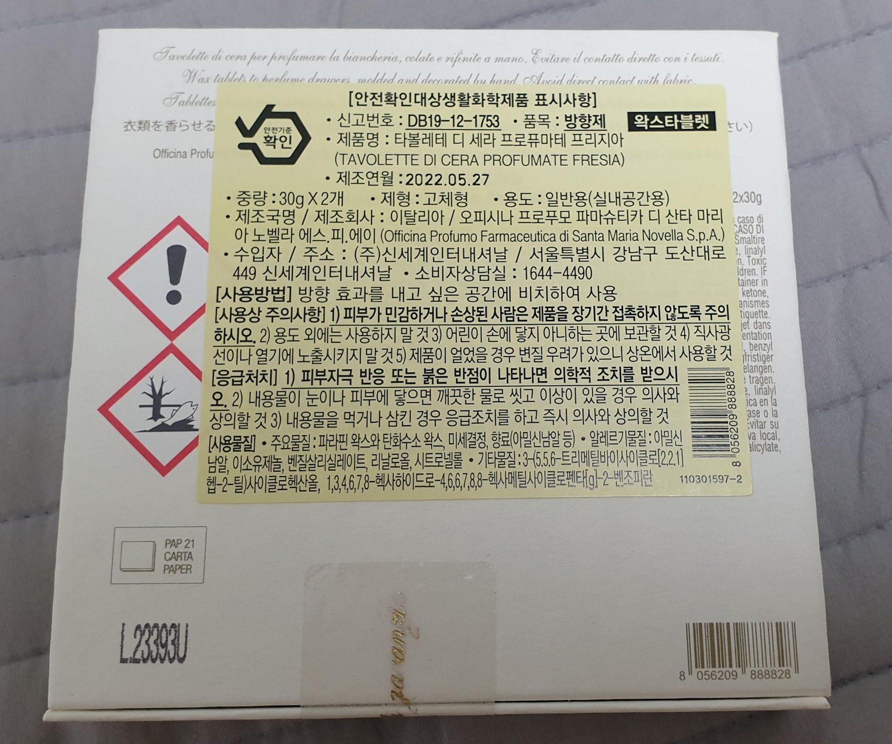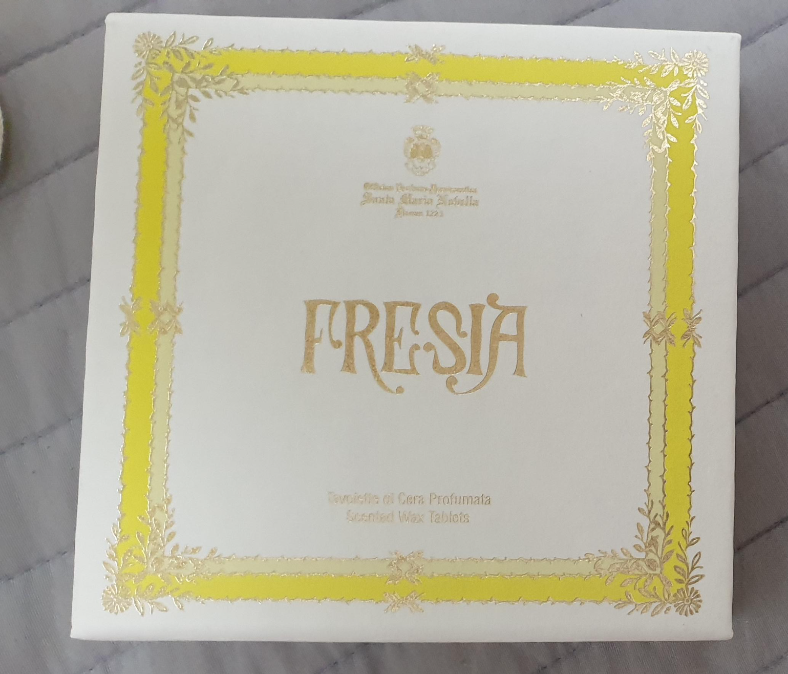 얼마 전에 집에 생긴 '타볼레테 디 세라 프로퓨마테 프리지어(TAVOLETTE DI CERA PROFUMATE FRESIA)' 긴 이름의 고체형 방향제입니다. 뭔가 고급스러운 포장이네요.
