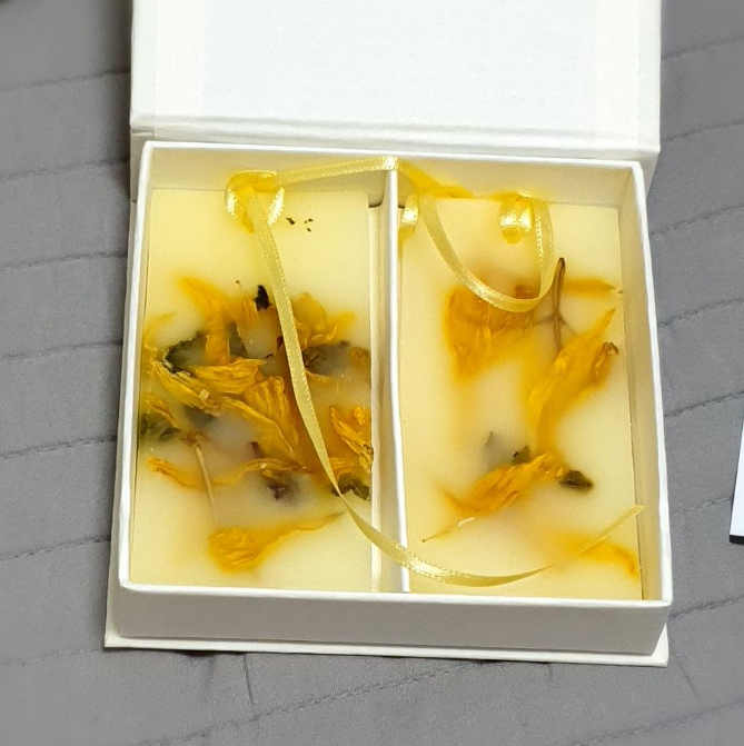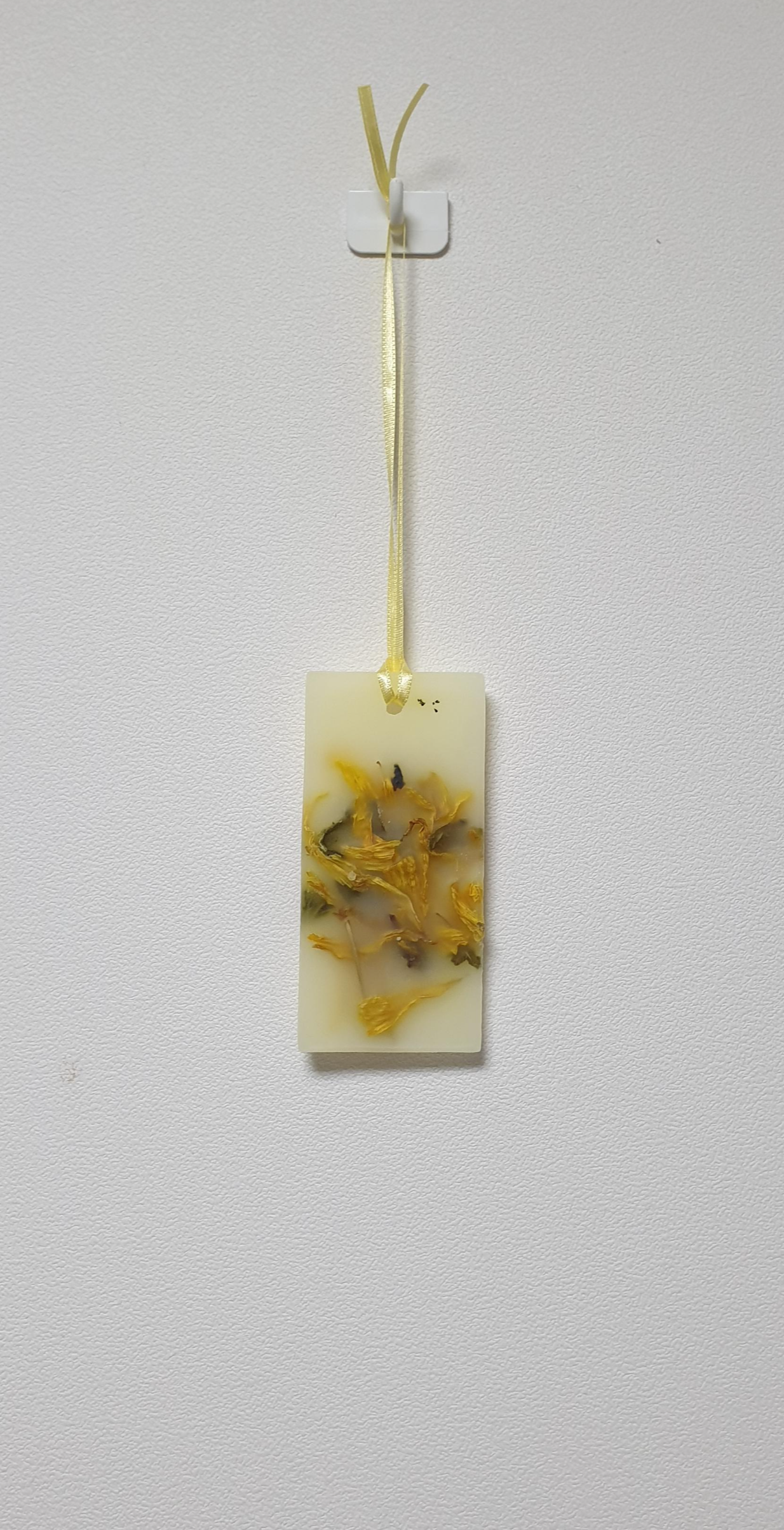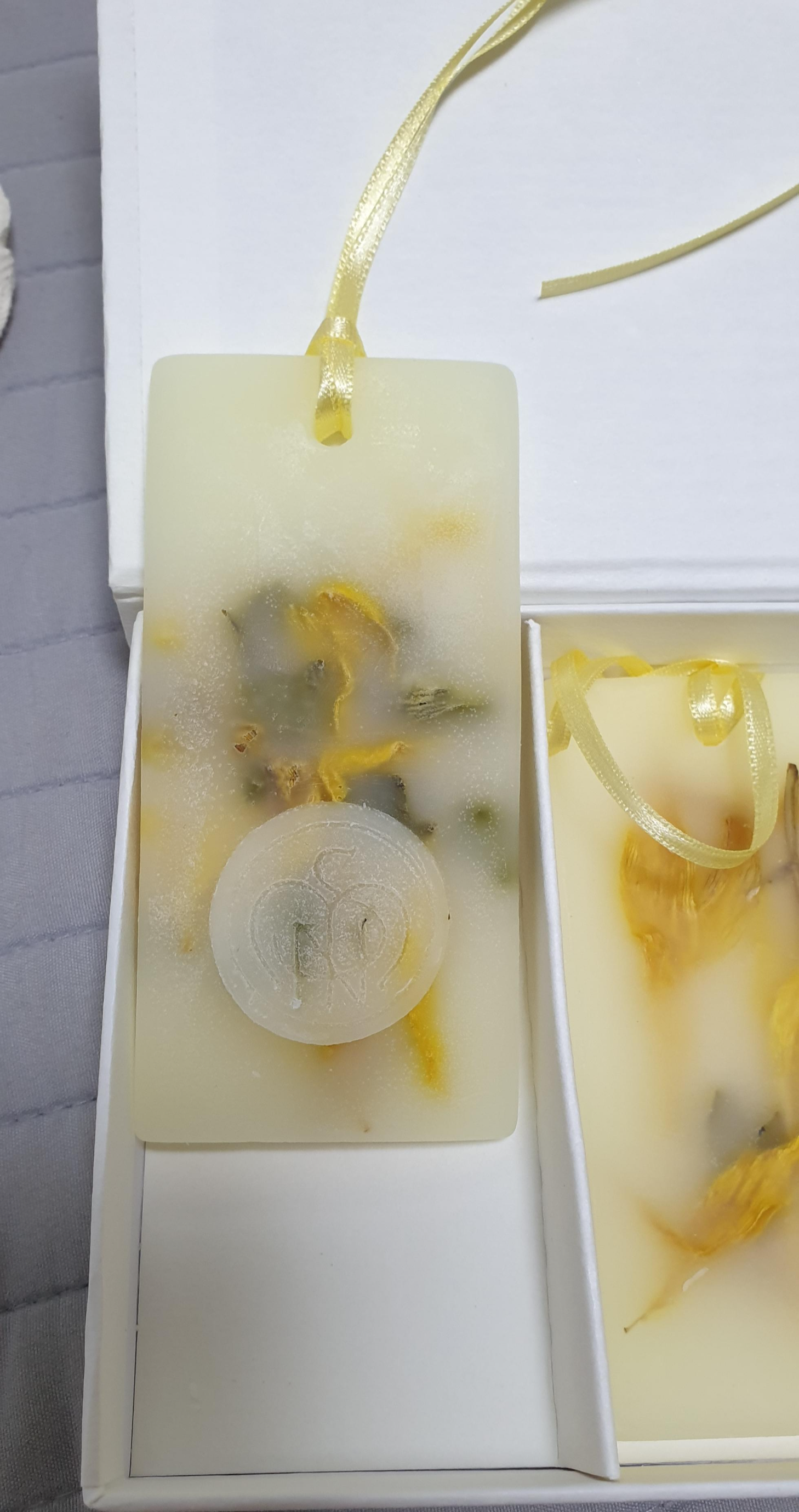 안에 꽃잎이 보이는 방향제가 2개 들어있습니다. 한 개 당 중량은 30g인 왁스 바? 고체의 사각형이 2개 들어있네요, 리본이 달려있어서 고리로 묶어서 원하는 위치에 매달아 사용하는 것 같습니다.