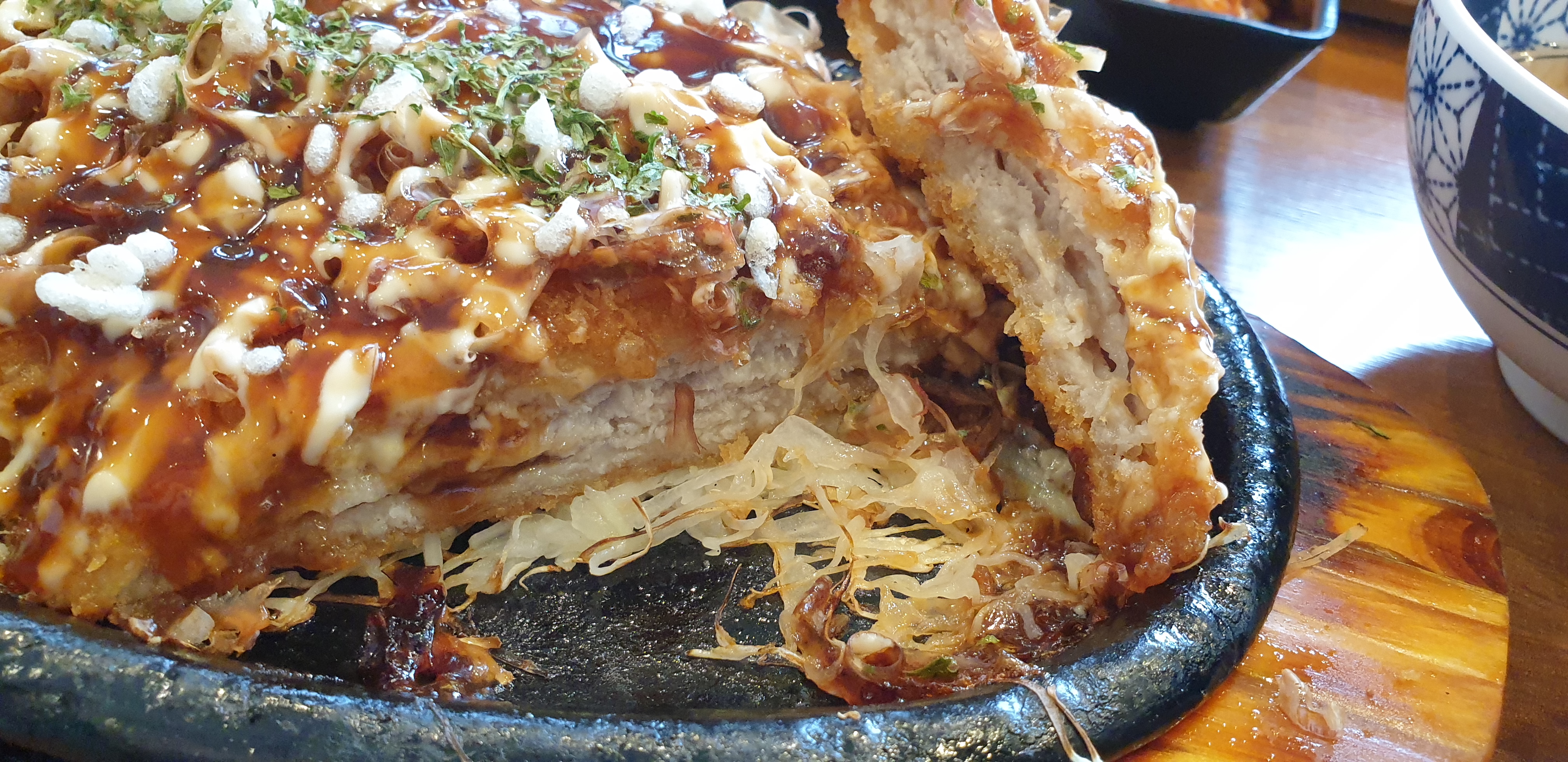 오코노미카츠는 일단 외관이나 냄새가 진짜 오코노미야끼 같은 모습입니다. 음식이 나올 때부터 지글지글 소리가 나서 더 기대가 되더군요.