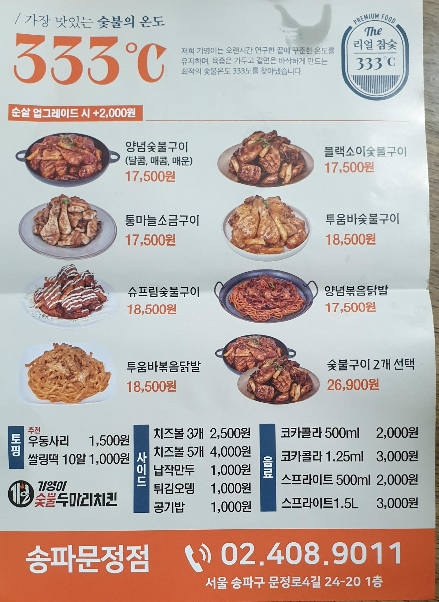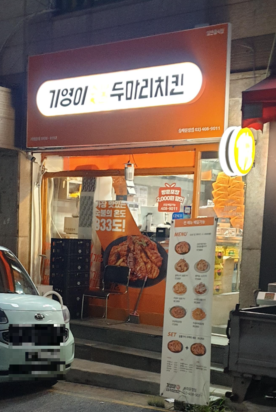 얼마 전 산책을 하다가 문정동 골목에 기영이숯불두마리치킨이라는 치킨집이 눈에 들어왔습니다.