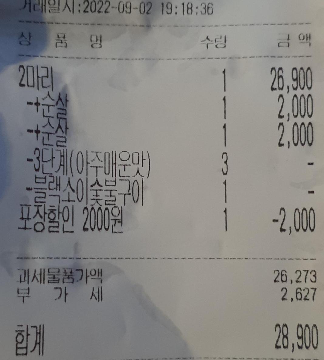 저는 26,900원 두 마리 세트를 둘 다 순살로 바꿔서 30,900원 거기에 포장할인 2000원 빠져서 28,900원에 구매해 왔습니다.