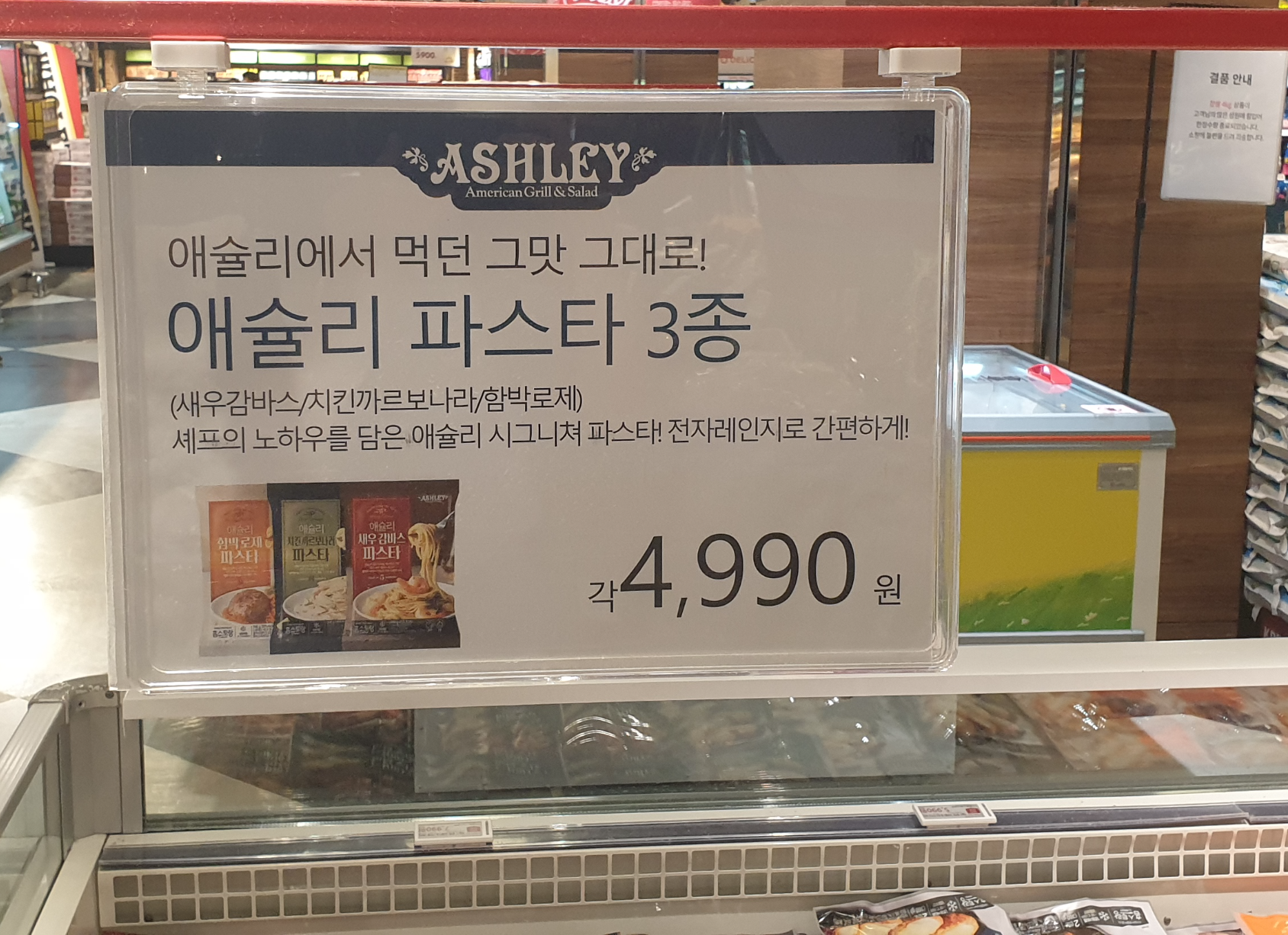 가든파이브에 있는 킴스클럽에서 장을 보다가 마주친 애슐리 파스타... 맨날 팔고 있는 건 봤는데 한 번도 안 먹어봐서 이참에 점심으로 먹어봤습니다. 아쉽게도 새우 감바스는 안 보여서 못 샀네요.