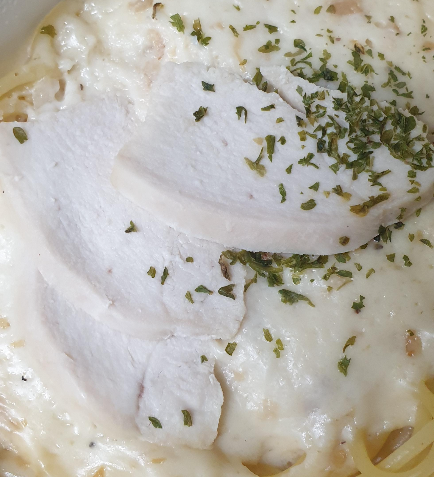 애슐리 치킨 까르보나라 파스타는 외관상으론 닭가슴살 3조각 그리고 파슬리가루와 소스 말곤 안 보이네요.