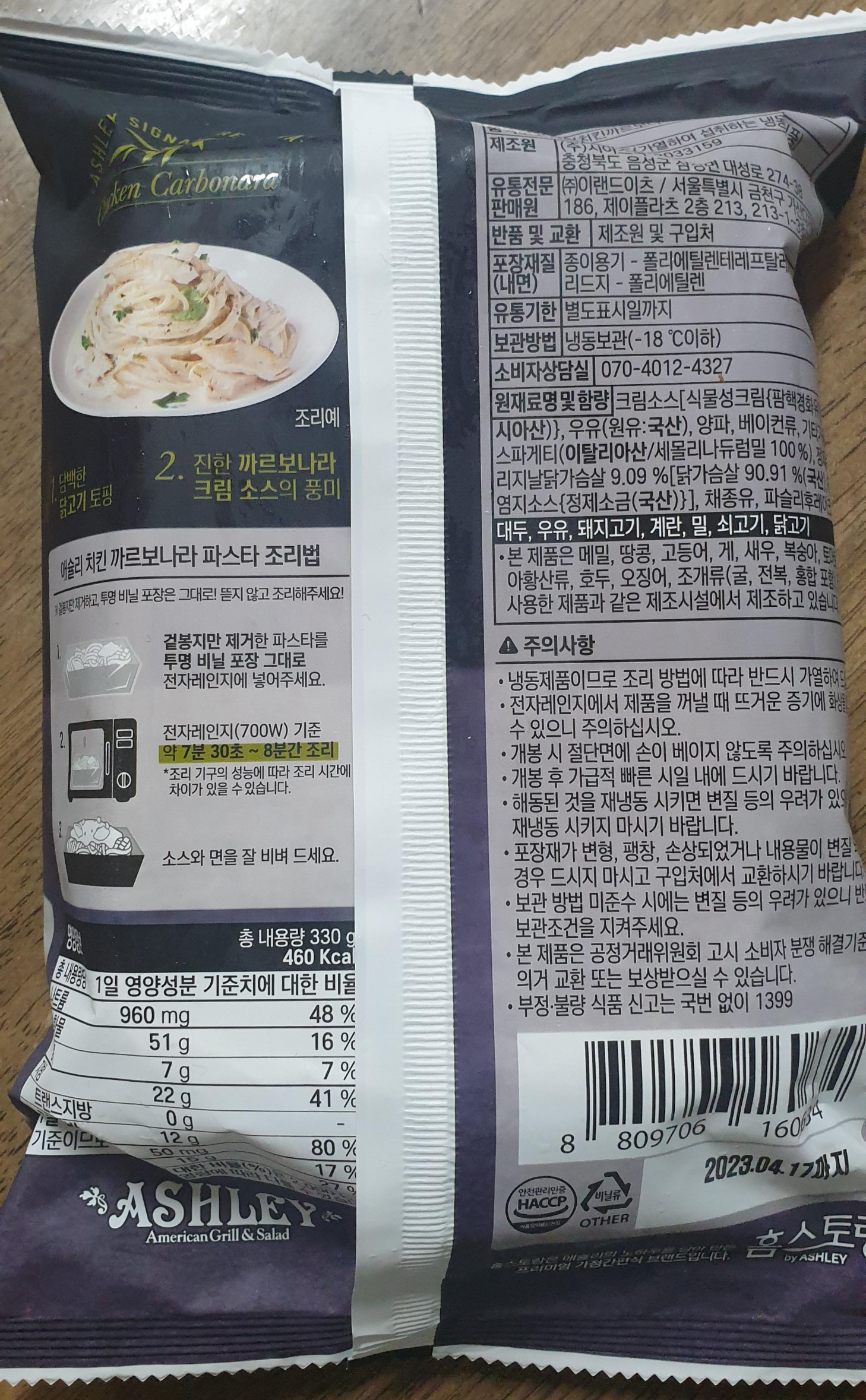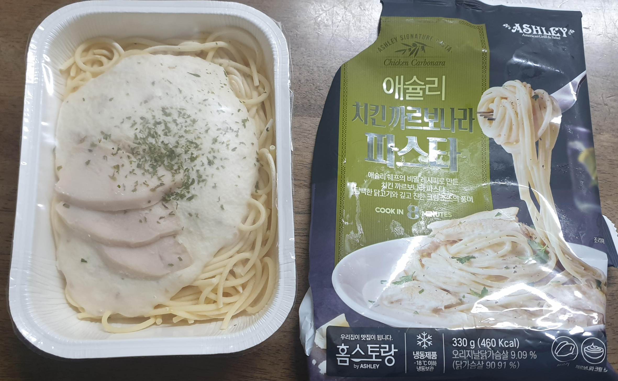 애슐리 치킨 까르보나라 파스타는 일단 섞었을 때 뭔가 로제 파스타보다 아래에 수분 같은 게 많아서 뭔가 이상해 보였지만 막상 다 섞고 먹어보니 소스 자체는 로제 파스타보다 맛있었습니다. 닭가슴살은 그냥 퍽퍽 가슴살이라 그냥 씹는 느낌이 있다 정도고 따로 집에 있는 후추를 좀 뿌리고 먹으니 맛있더군요.