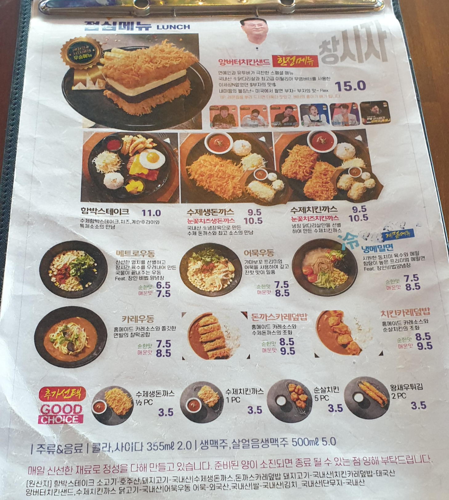 원래는 앙버터치킨샌드를 포장해 가고 싶어서 들렸지만... 아쉽게도 우동 같은 면요리와 앙버터 치킨 샌드는 포장이 안된다고 하네요. 그래서 포장해간 음식은 수제치킨가스 (9,500원)과 순살치킨 5 PC (3,500원)을 포장해왔습니다.