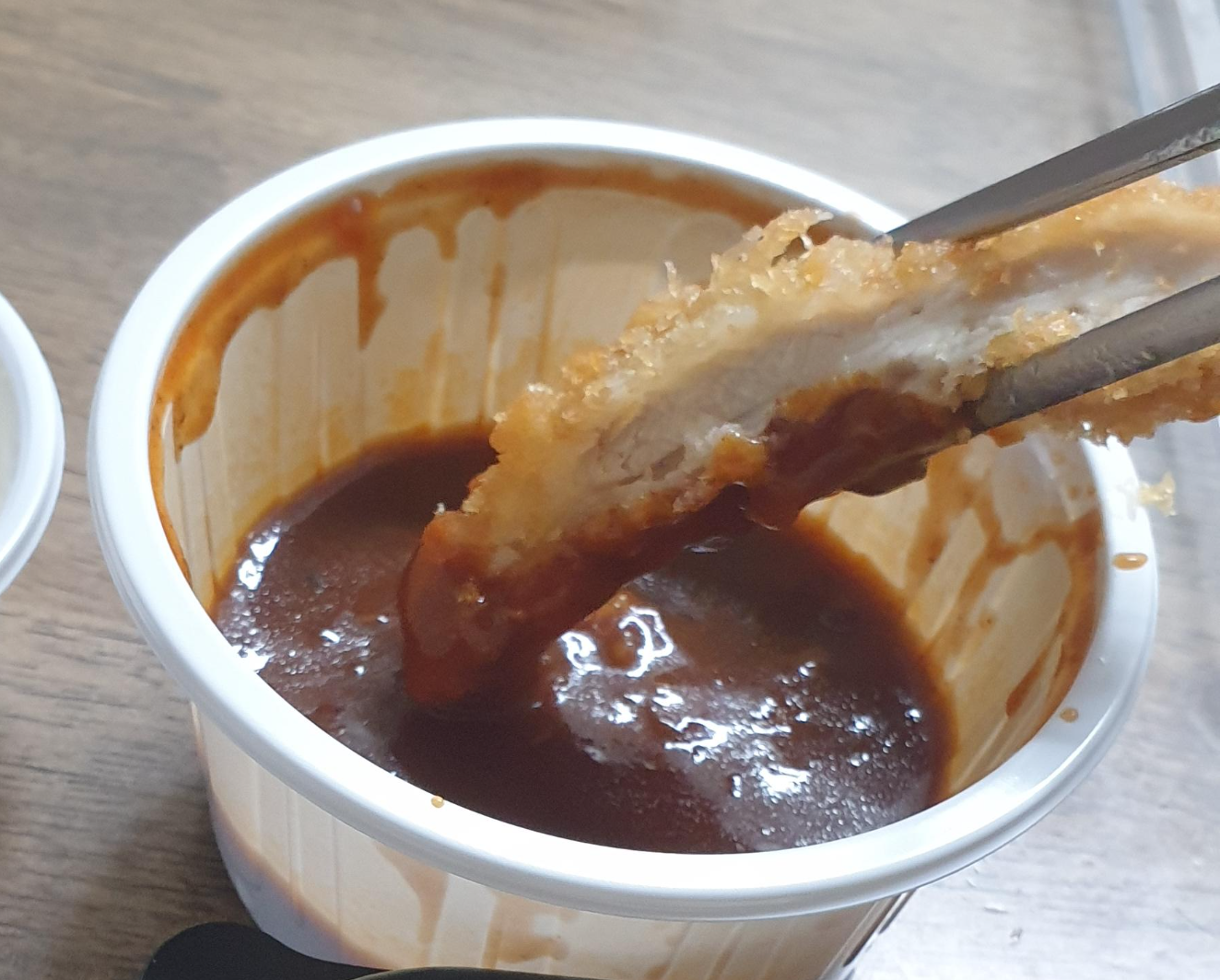수제치킨까스는 일단 외견은 돈가스... 맛은... 혀가 둔감한 저는 치킨가스라고 말 안 하면 부드러운 돈가스라고 인식했을지도 모를 것 같습니다. 닭고기가 얇은 것 그리고 튀김옷과 소스 때문인지 더 돈가스 같은 맛이었습니다. 살은 다릿살로 만들었다고 하는데 좀 더 두꺼웠다면 치킨맛도 더 강하고 좋지 않았을까...라는 생각을 했네요. 맛있는 돈가스 같은 느낌으로 먹었습니다.