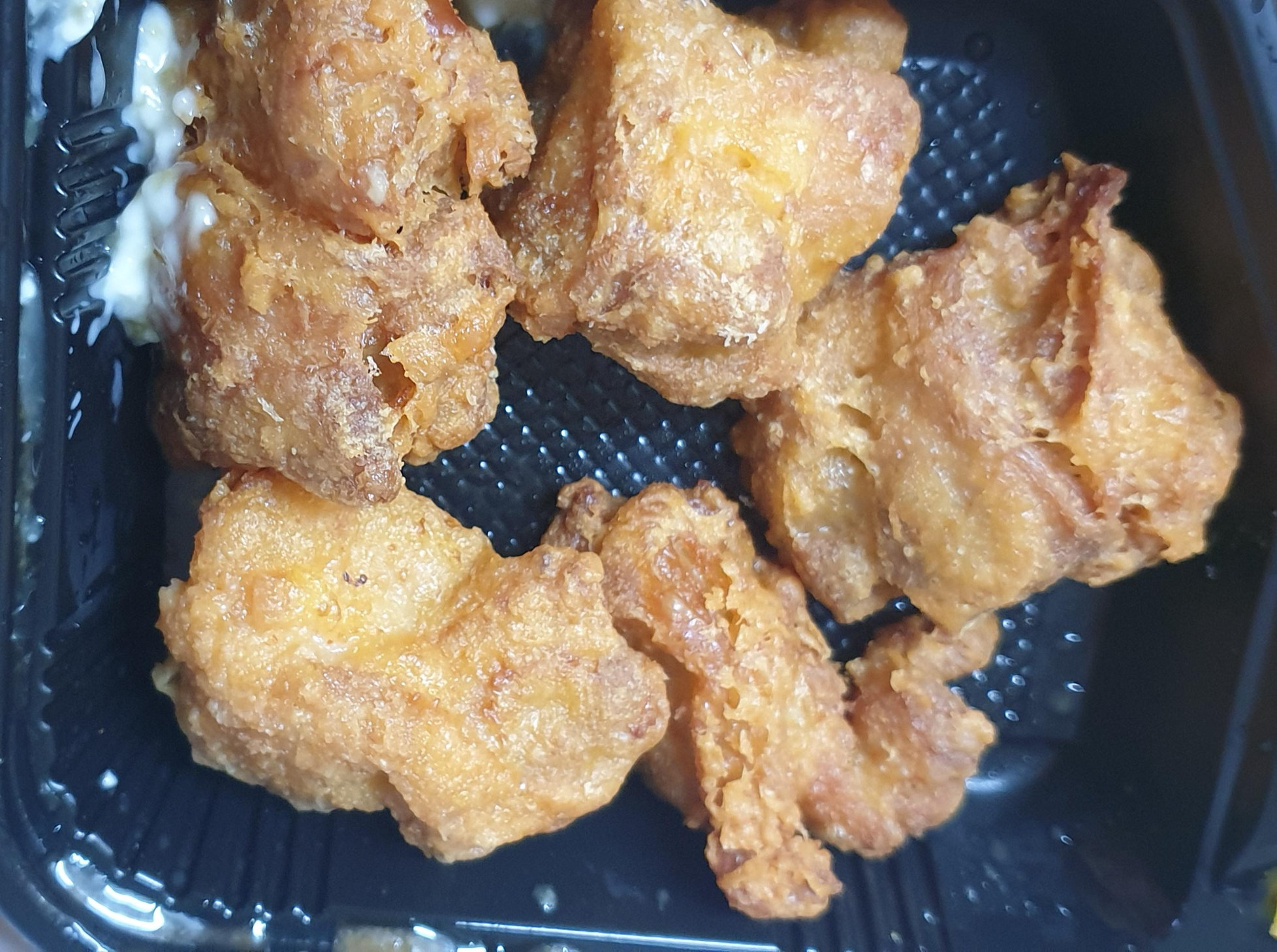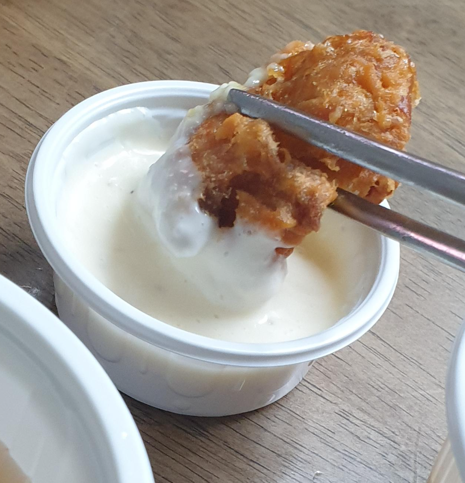 도시락 업체에서 치킨 도시락 먹을때 들어있는 가라아게 느낌이었네요. 흰색 소스는 안 어울리는 것 같았습니다.