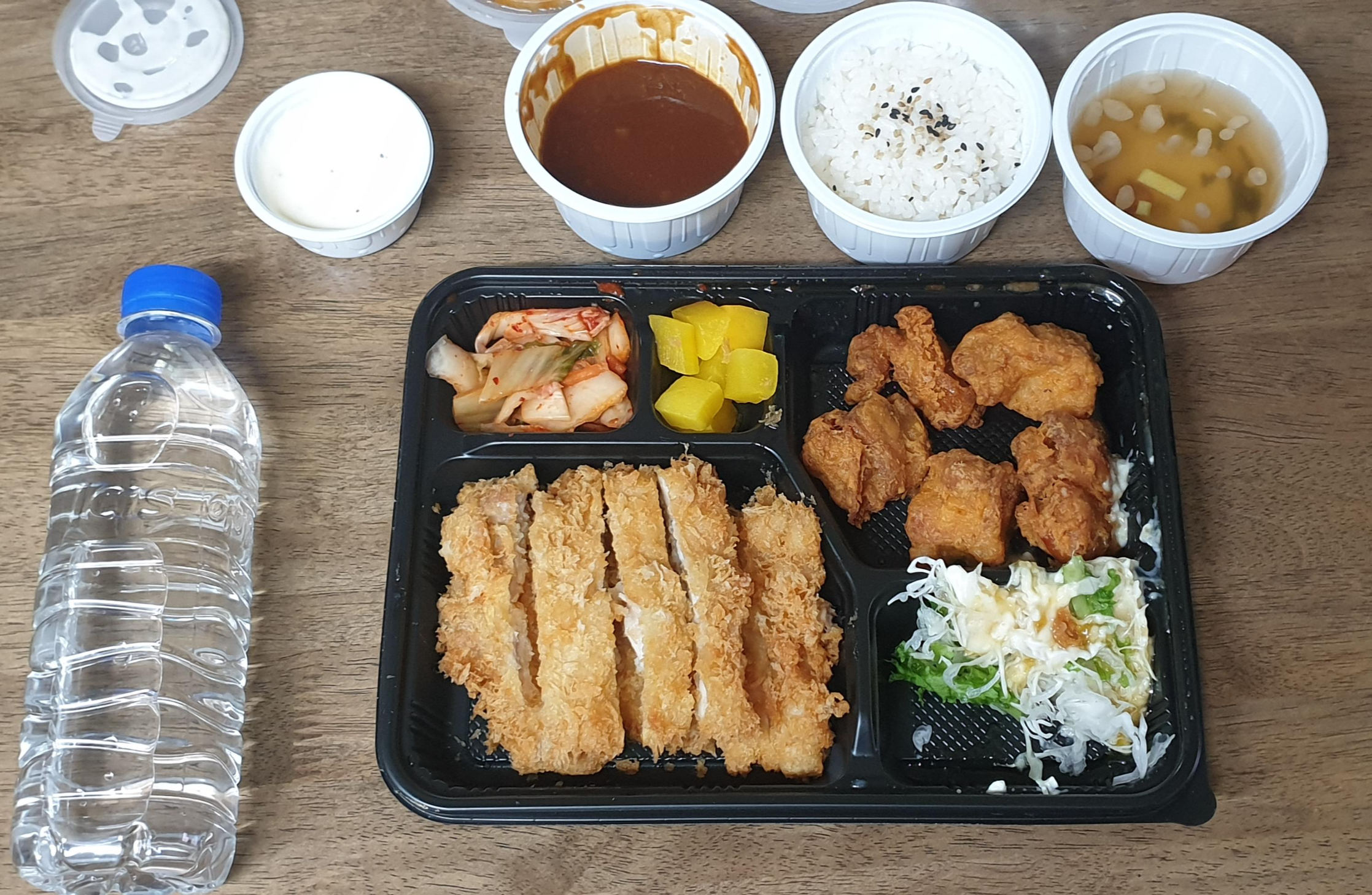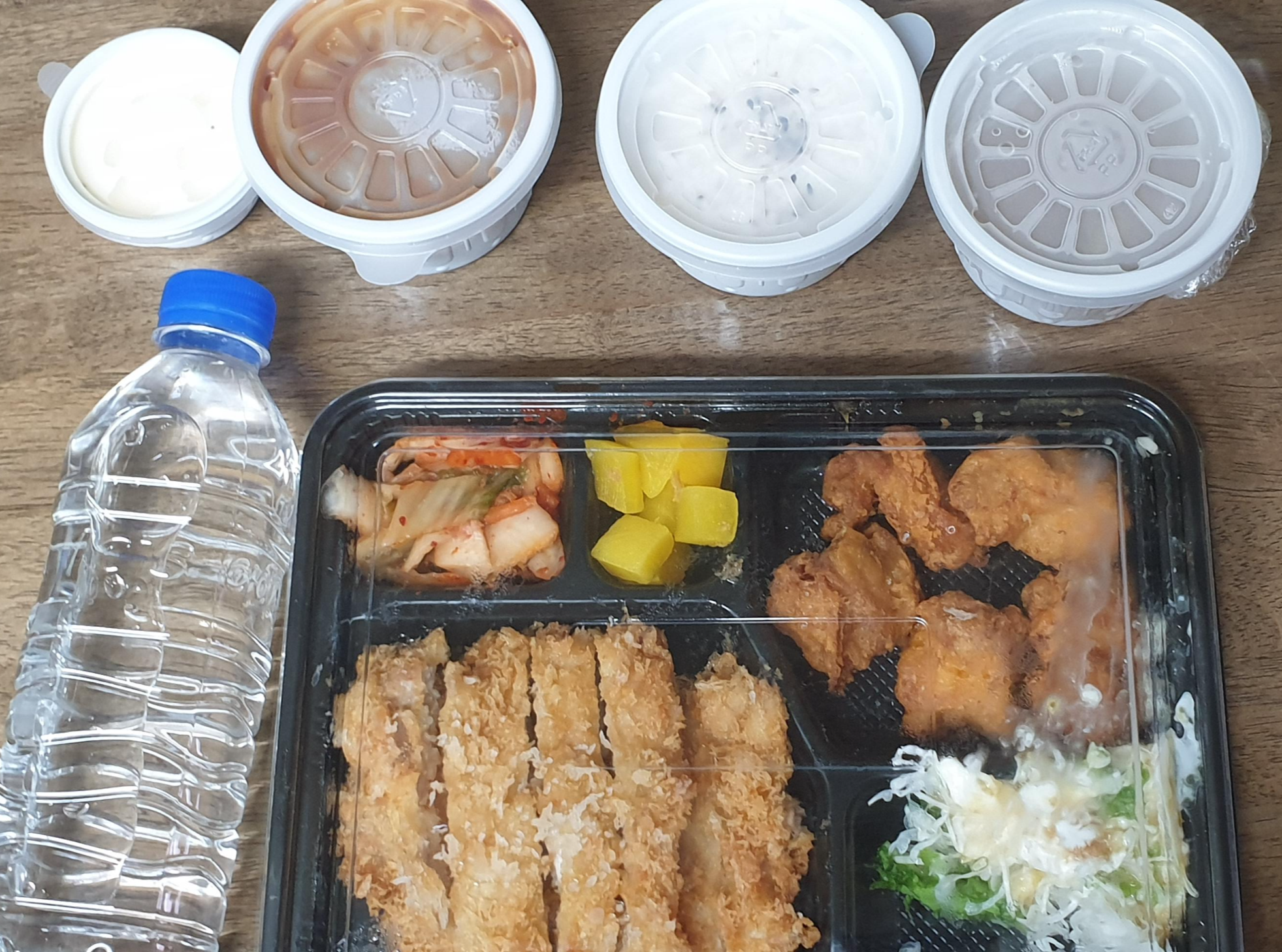 그리고 따로 주문한 순살치킨 5개, 샐러드, 단무지와 김치, 그리고 돈가스 소스와 밥과 국 치킨 소스 같은 타르타르 같으면서도 타르타르보다 조금 더 새콤한 것 같은 소스가 들어있습니다.