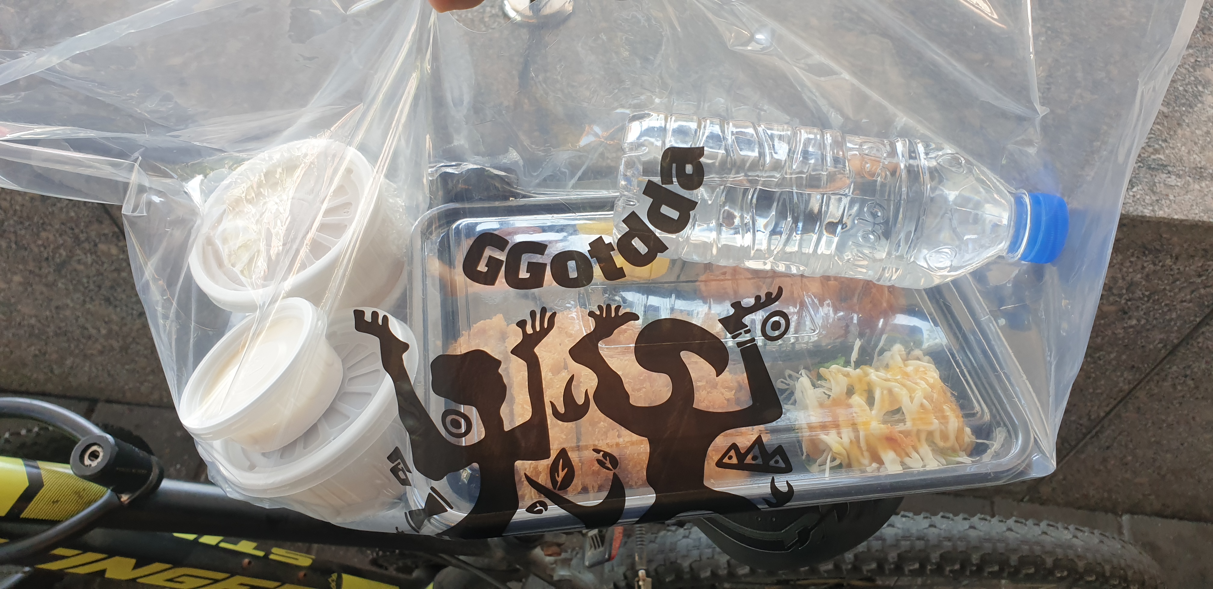 봉투가 치킨기준이라 그런지 도시락은 계속 한쪽으로 쏠리더군요. 물병 때문인 것도 같은데... 결론은 구매해서 집에 도착하니 봉지에 김치 국물이 새서 김치 냄새가... 그리고 치킨에 샐러드가 침범하고 있더군요.