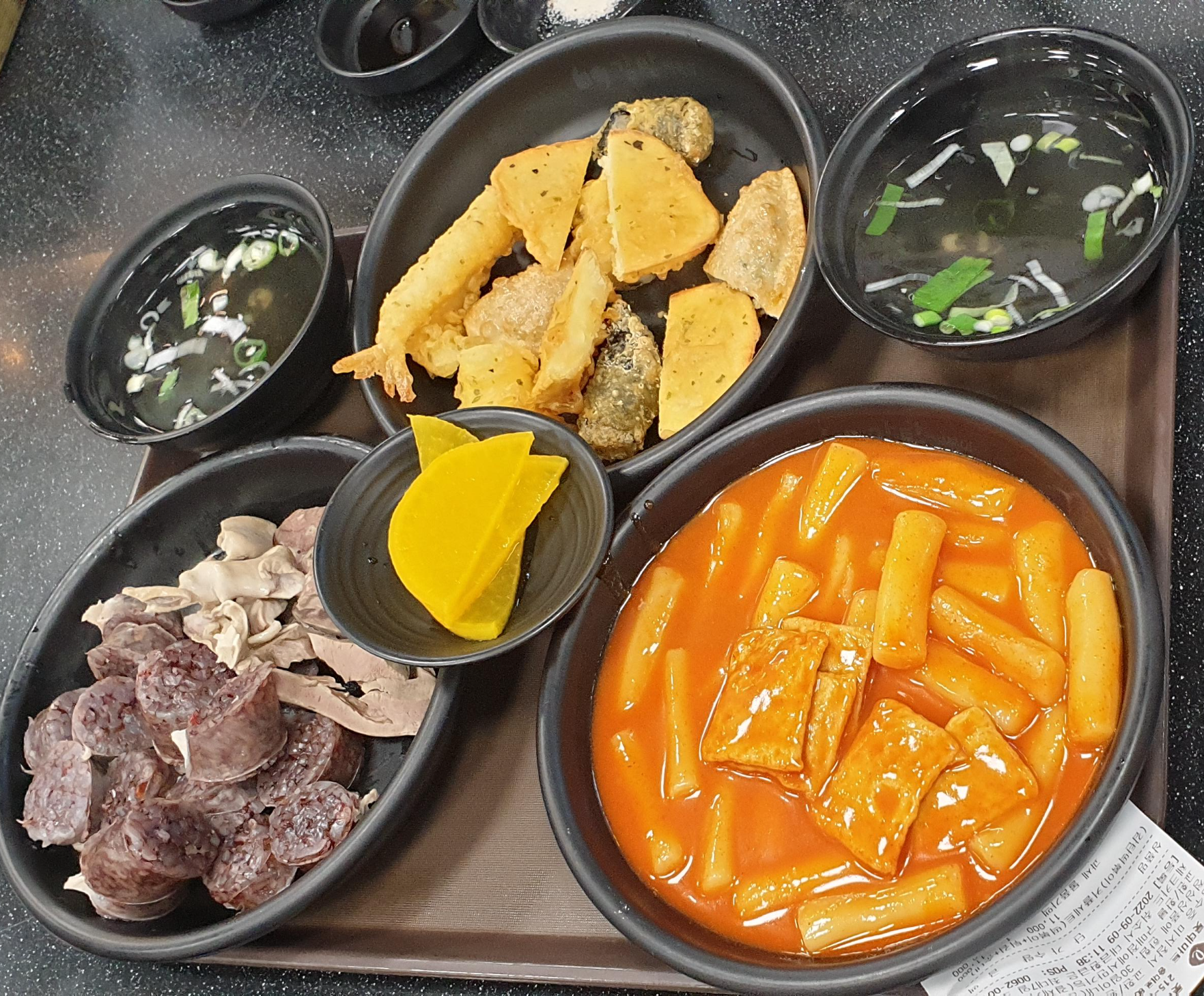 순대와 떡볶이 그리고 튀김, 단무지와 국물은 어묵 국물인 것 같습니다.