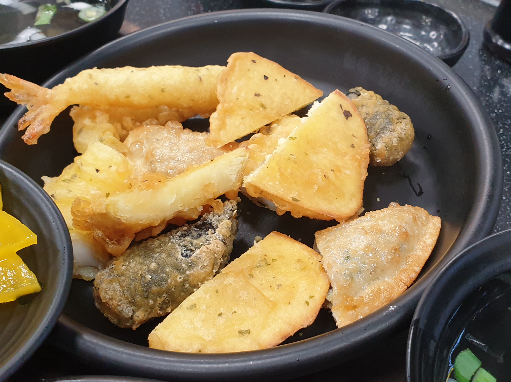 튀김은 고구마, 김말이, 오징어, 만두, 새우튀김이 있었습니다.