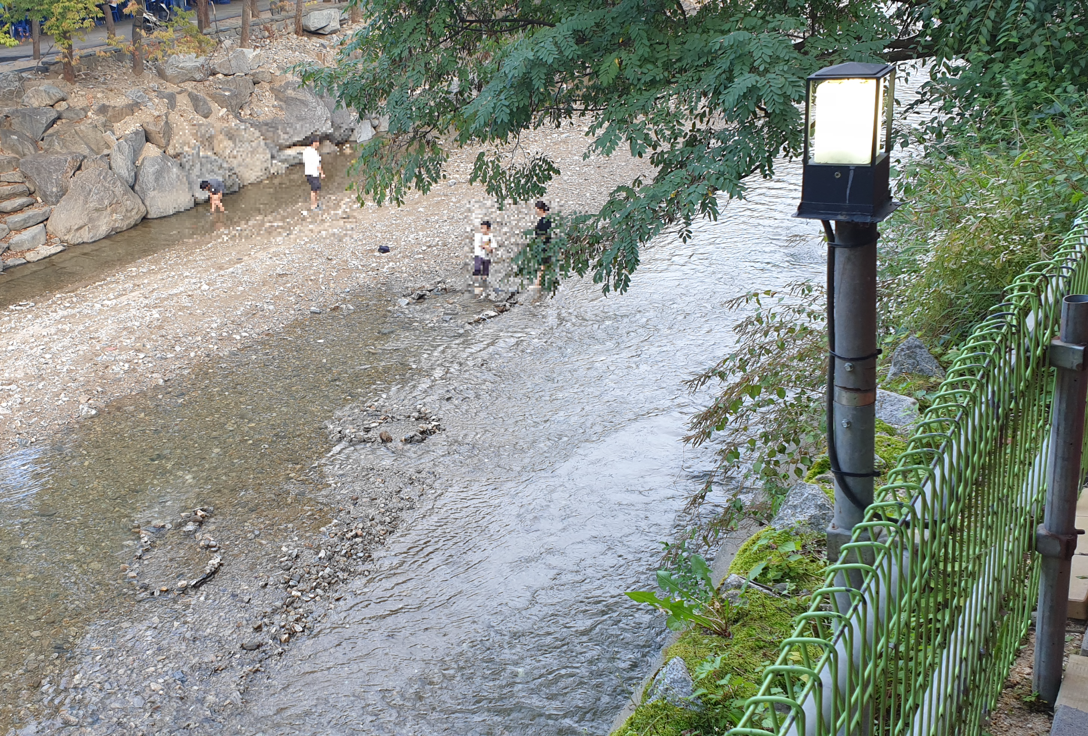 앞에 있는 계곡은 물이 얕아서 어린이들이 놀기에 좋아보였습니다.