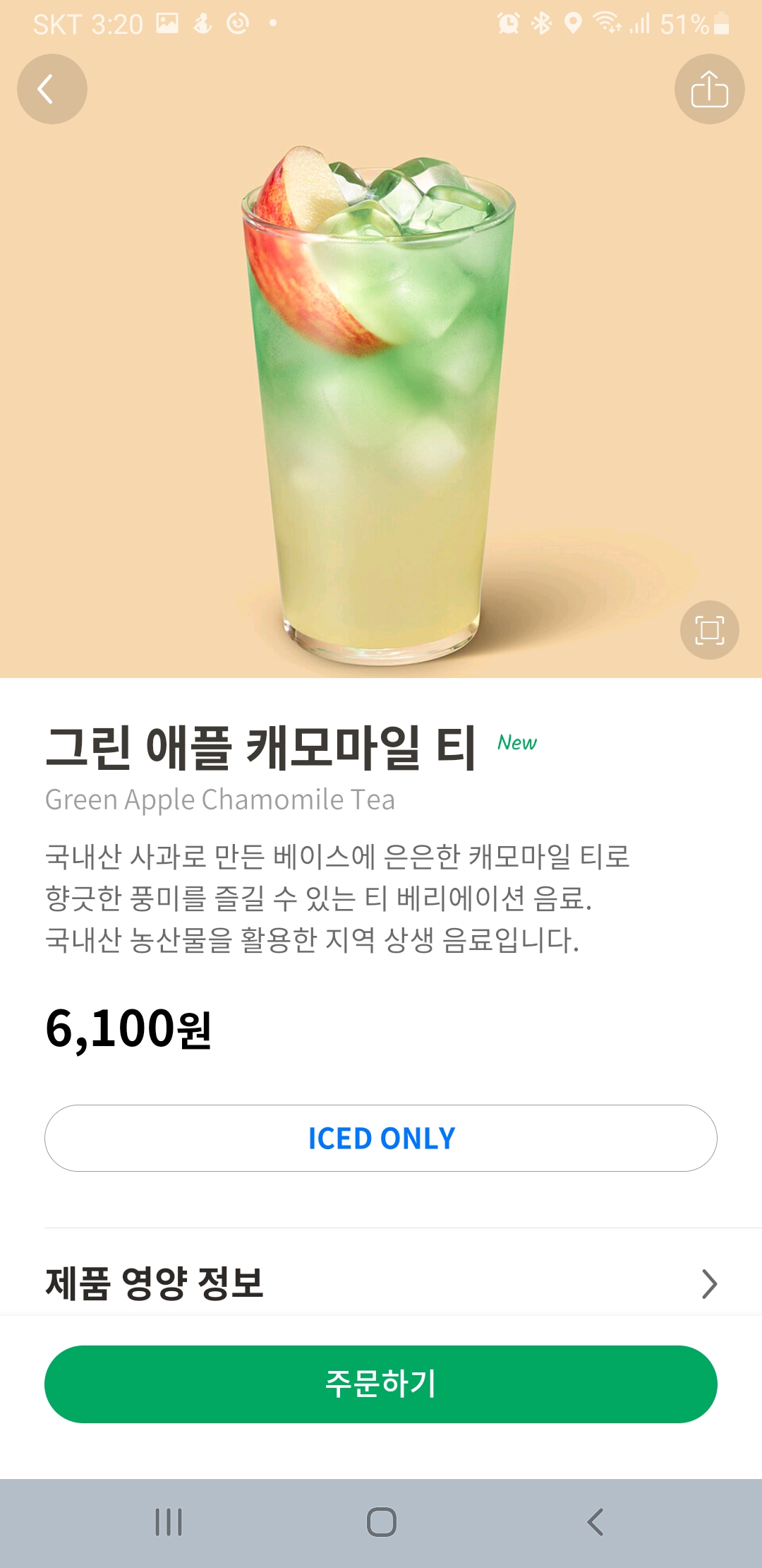 스타벅스에서 그린 애플 캐모마일 티라는 익숙하지 않은 음료가 있어서 한번 먹어봤습니다.