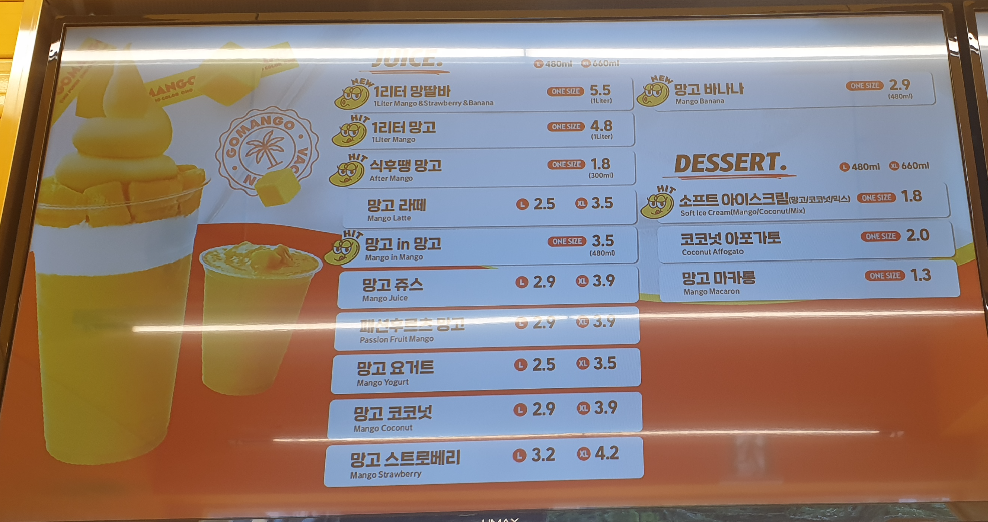 메뉴는 가게 이름에 맞게 다양한 망고 음료들을 팔고 있습니다.