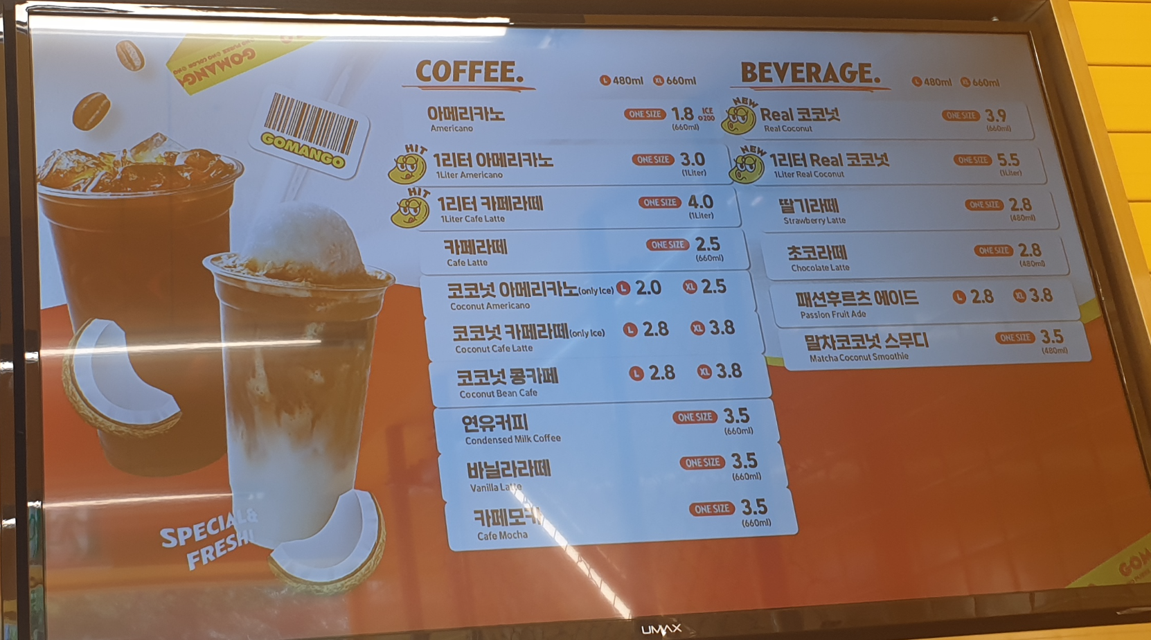 망고주스 말고도 일반 커피 같은 음료도 팔고 있습니다.