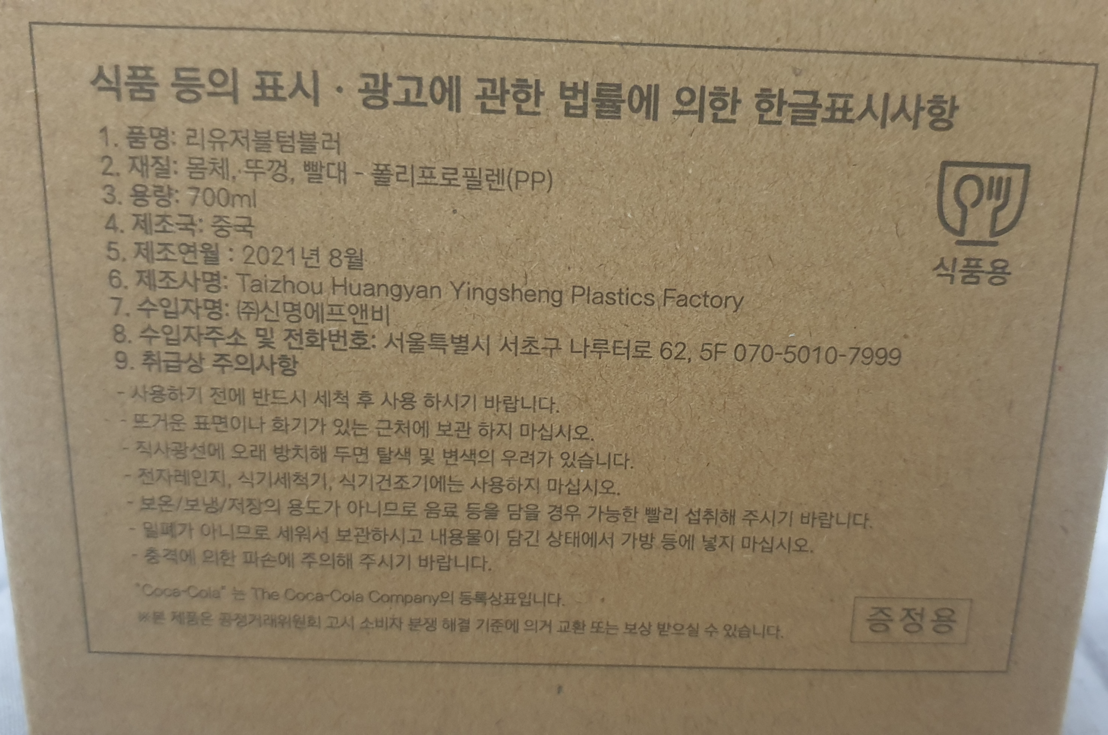 상자는 플라스틱 빨대와 리유저블 컵이 언뜻 보입니다. 중국에서 제조됐고, 용량은 700ml이네요.